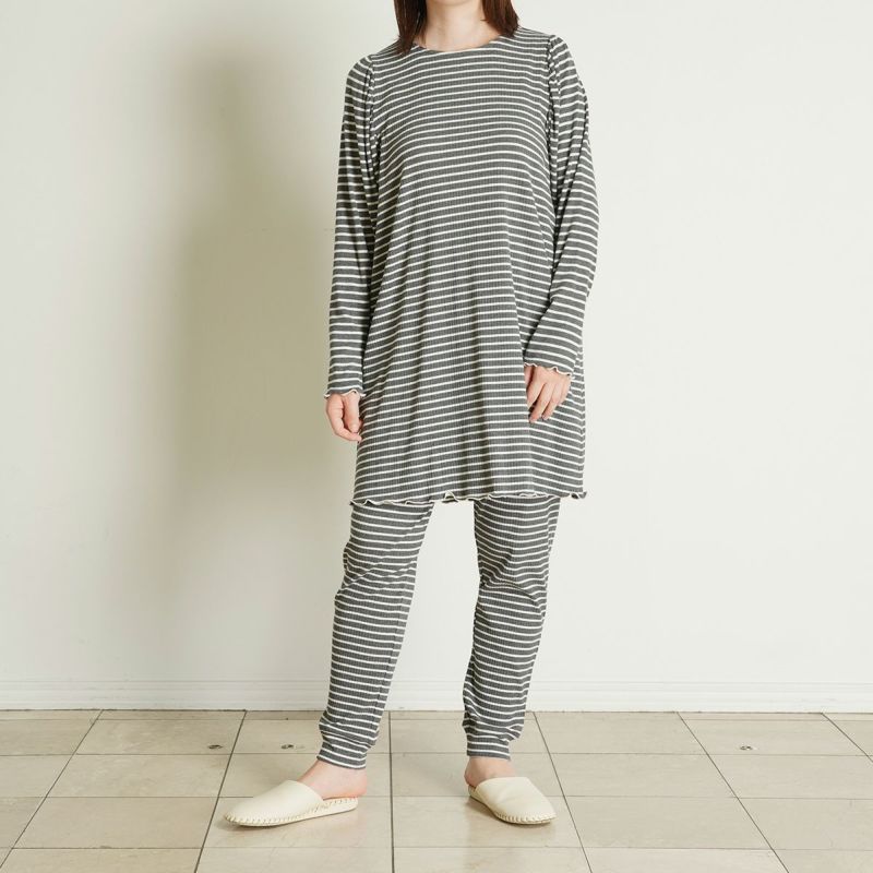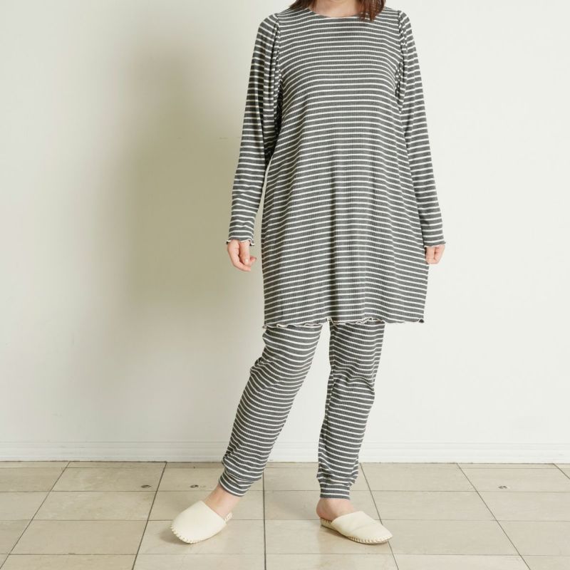 伸縮性のある素材のシンプルなデザインでリラックスウエアとしてはもちろん、ワンマイルウェアとしてもおすすめです。