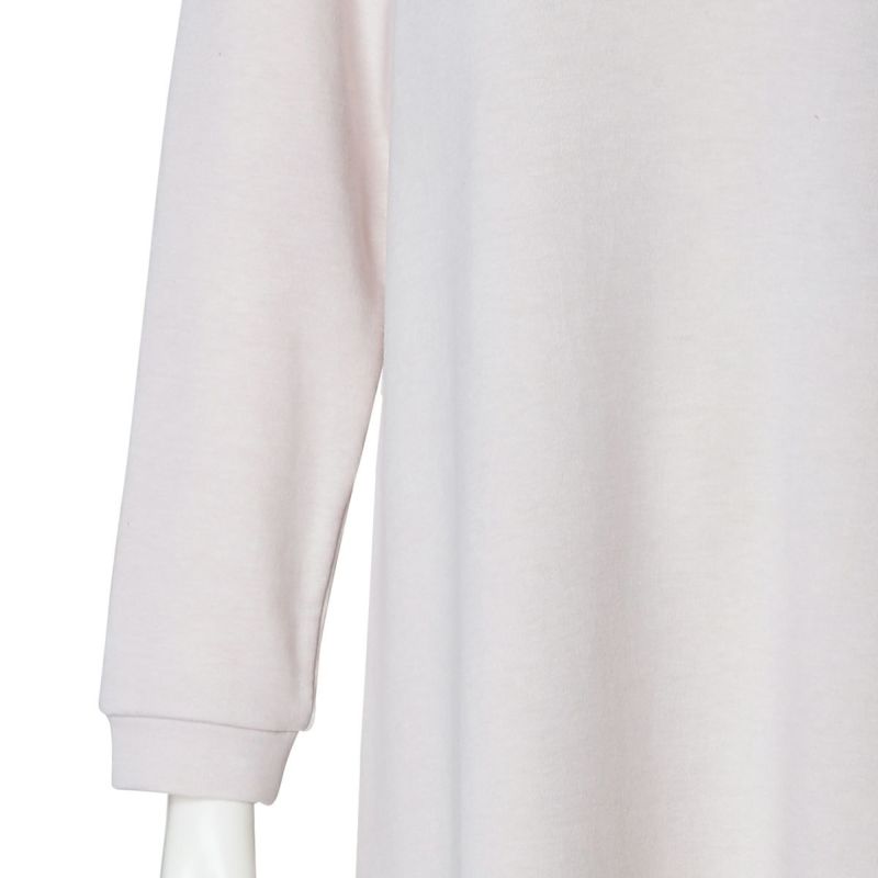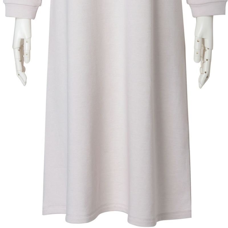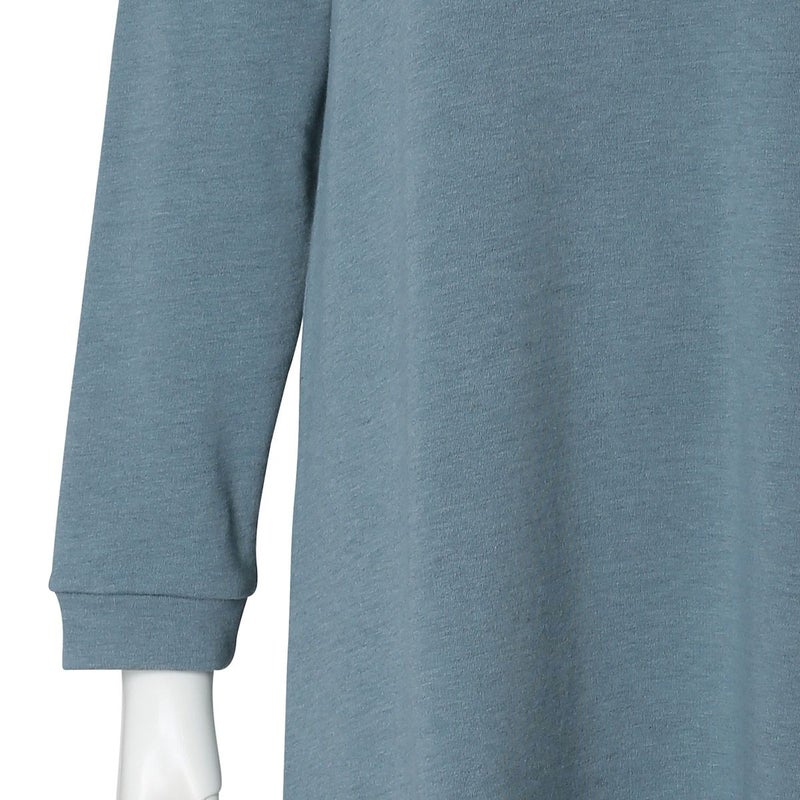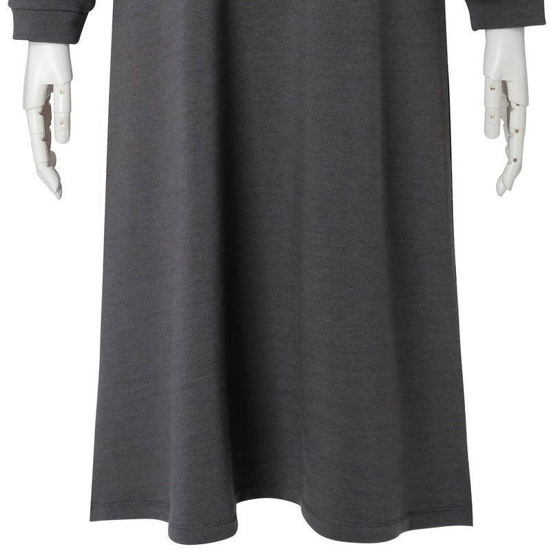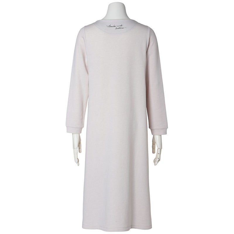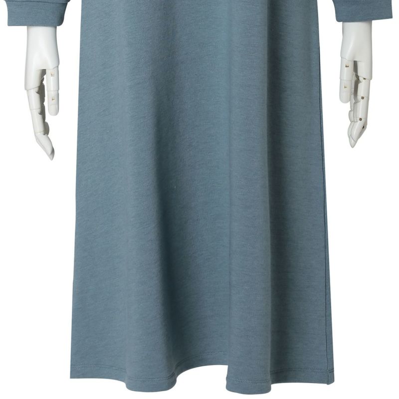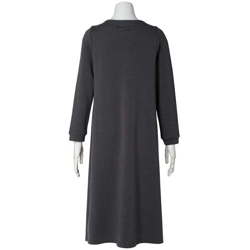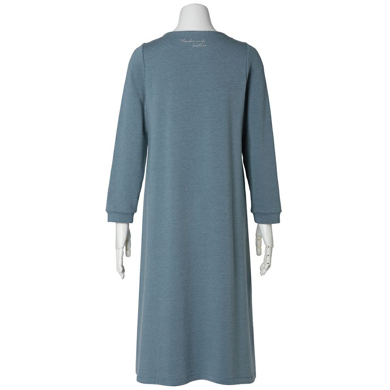 シンプルでベーシックなデザインの長袖ワンピース。リラックスタイムにはもちろん、ワンマイルウエアとしても活躍する便利な1枚。背ヨークに施した「Traveler with kidblue」の刺しゅうがアクセントになっています。