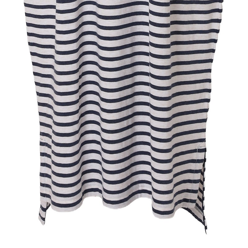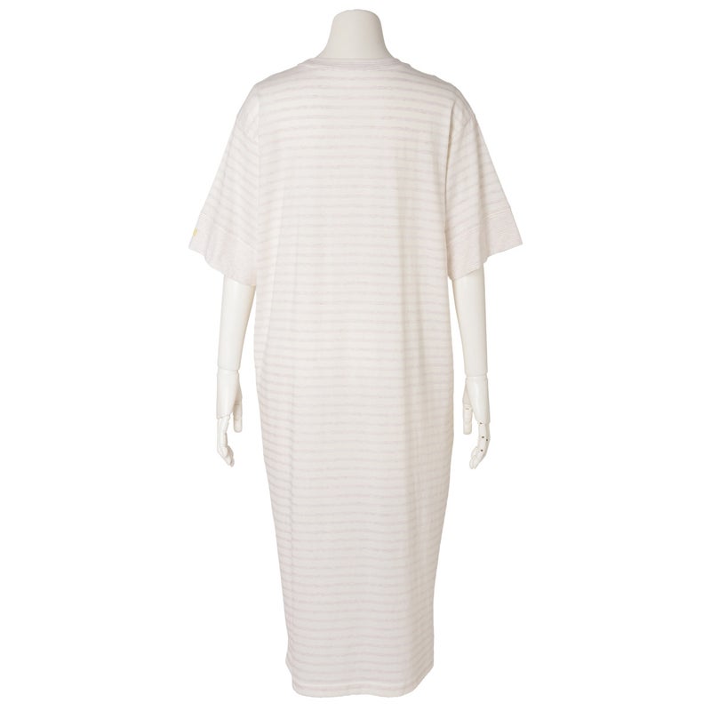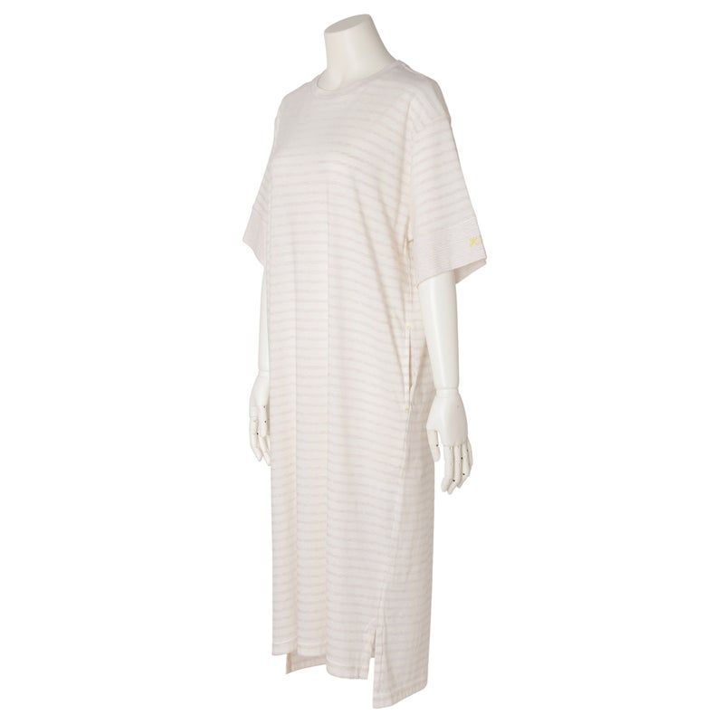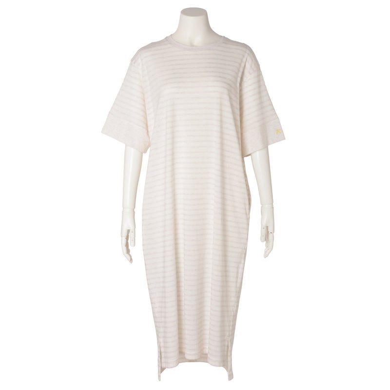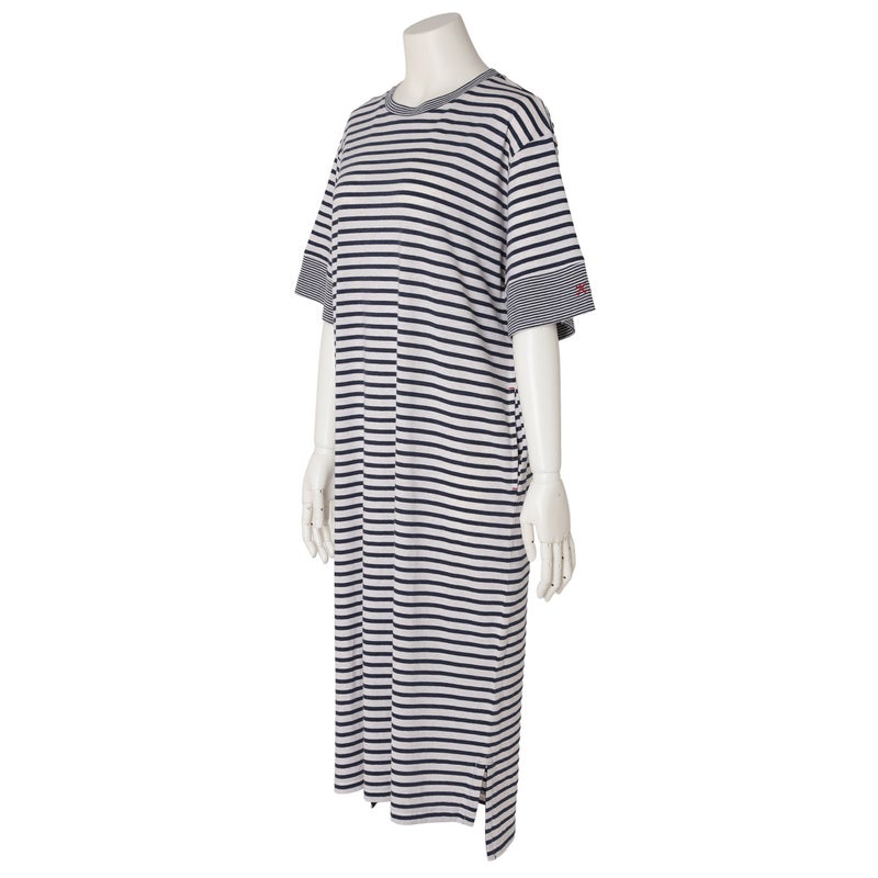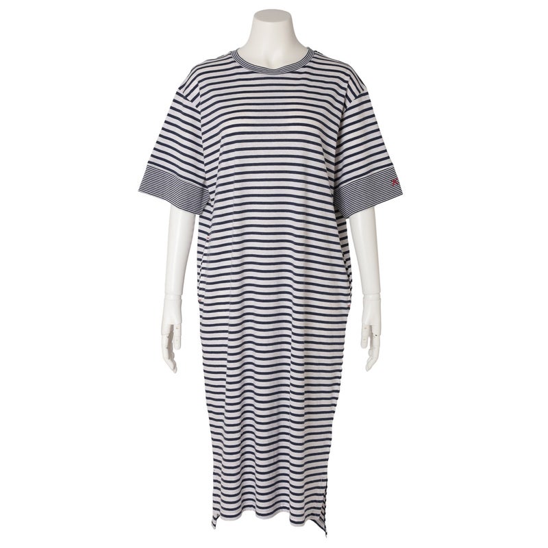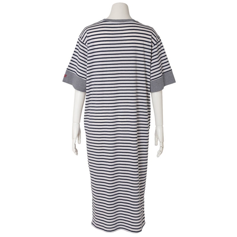1枚でサラッと着れるワンピース。やや太幅の袖口の切り替えや片方だけに配したロゴ刺しゅうなどこだわりの仕立て。便利な両サイドポケット付で色を効かせた配色止めステッチがポイント。ロゴとステッチはアイボリーはイエロー、ネイビーはレッドにしアクセントに。前後差をつけた裾のラインとサイドスリットで動きのあるシルエットを楽しめます。