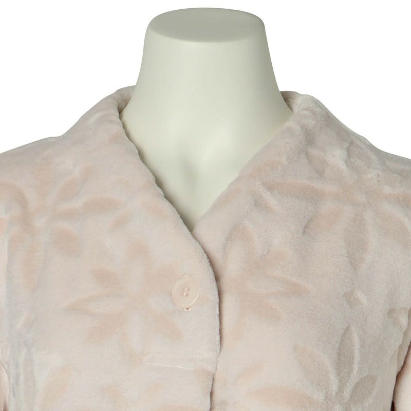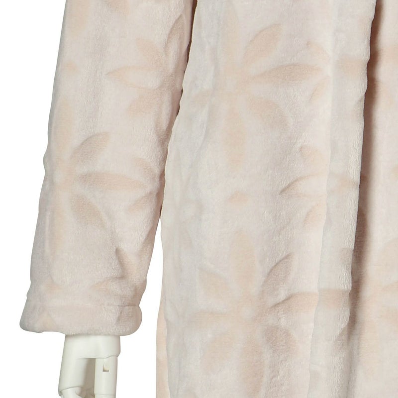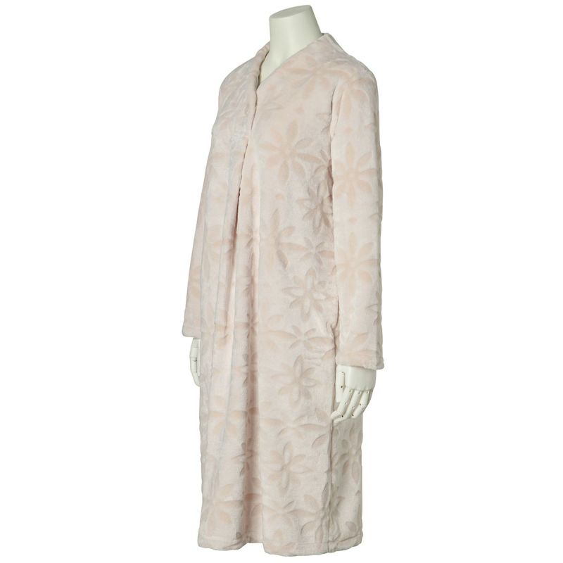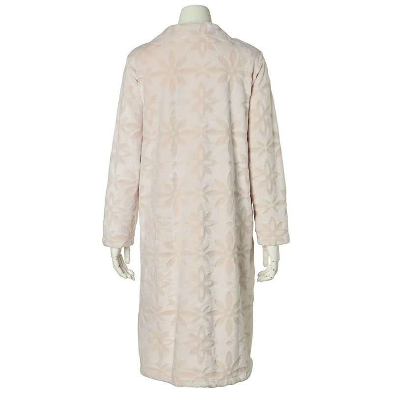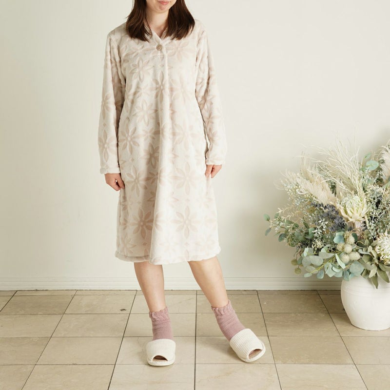 長袖ワンピースは、すっきりとしたノーカラーデザイン。センターに寄せたタックが女性らしいアクセント。リラックスタイムにおすすめ。
