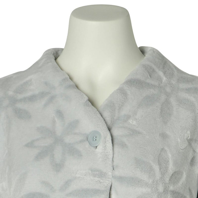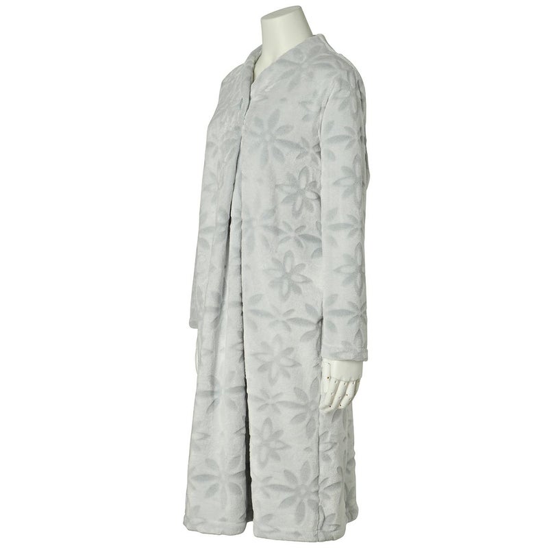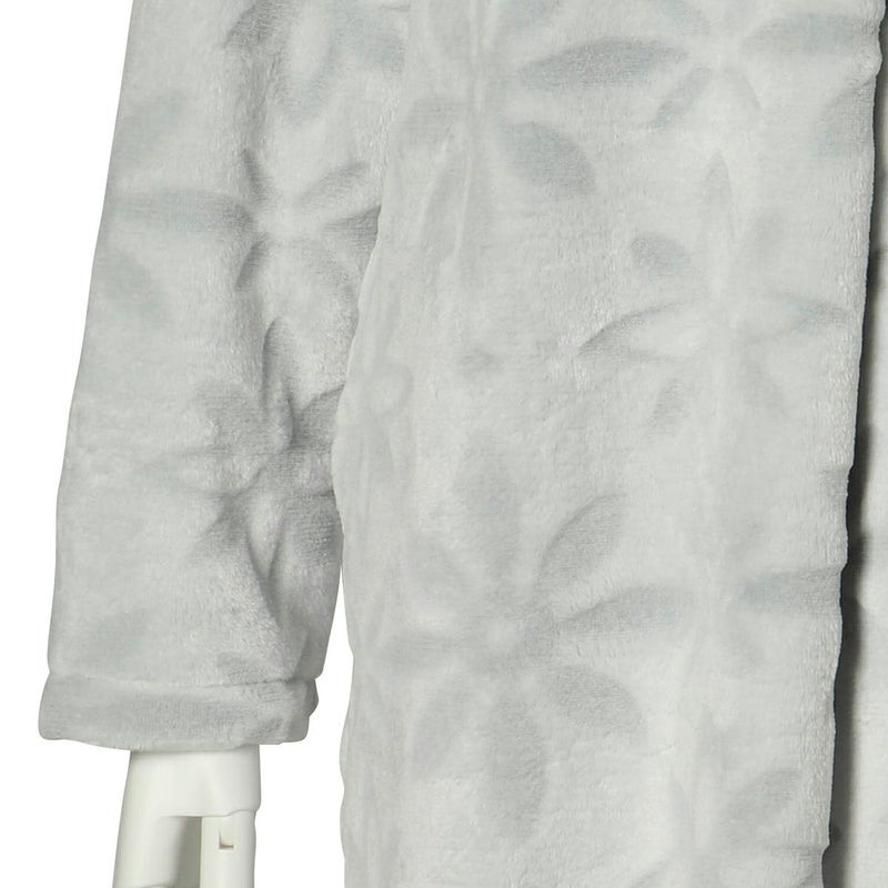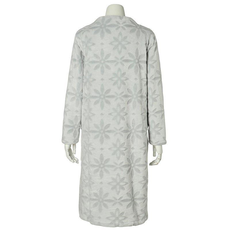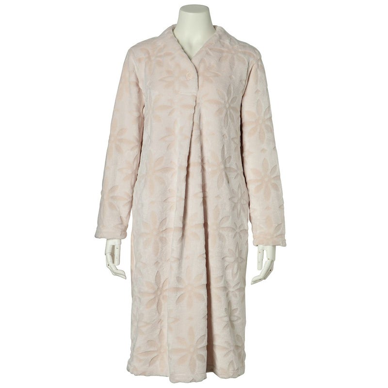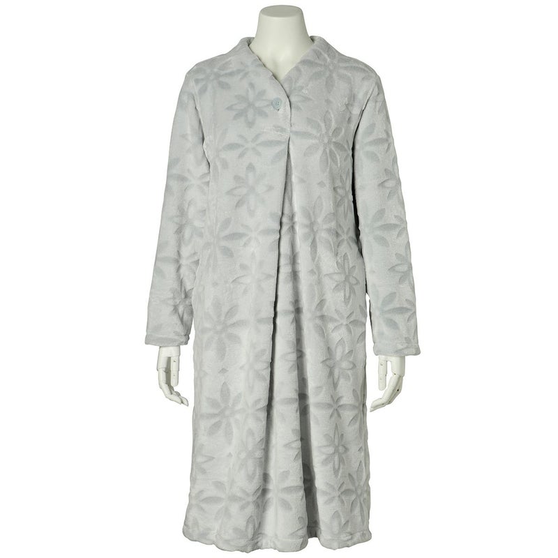 長袖ワンピースは、すっきりとしたノーカラーデザイン。センターに寄せたタックが女性らしいアクセント。リラックスタイムにおすすめ。