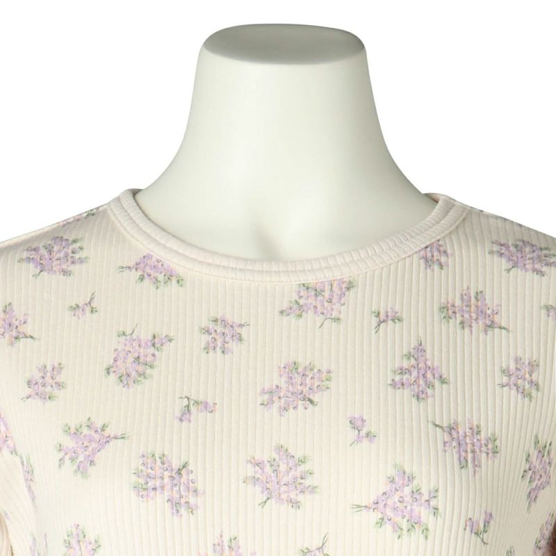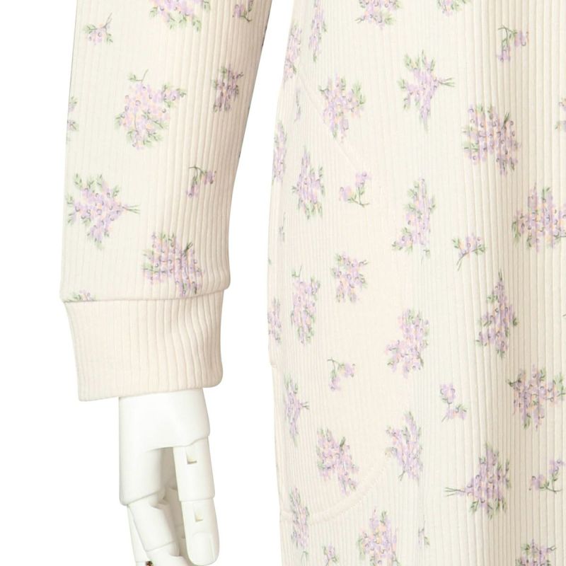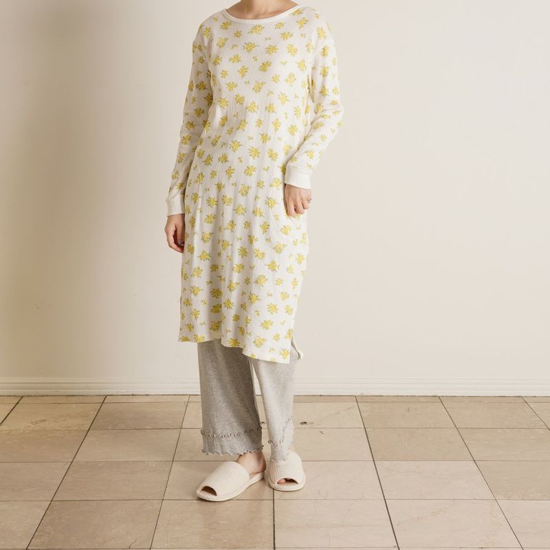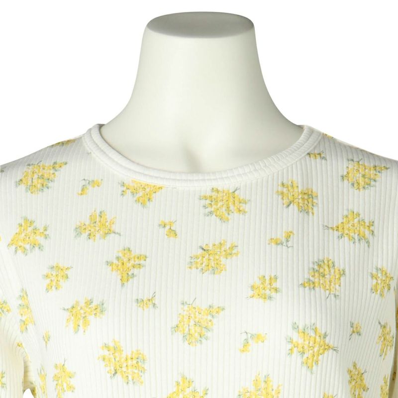 リブ生地特有の伸縮性のあるコットン100%の生地に華やかなミモザをプリントした総柄シリーズ。24ベアフライス、24オーガニックコットン裏毛とのクロスコーディネートも◎