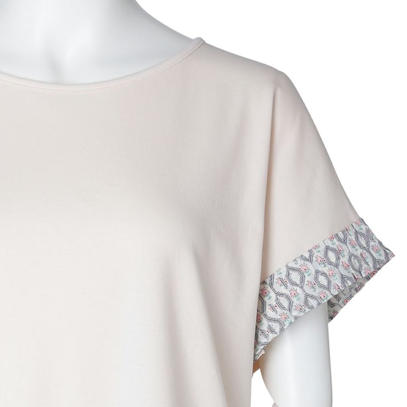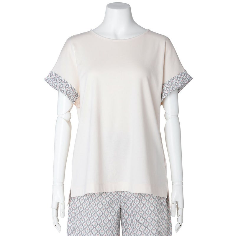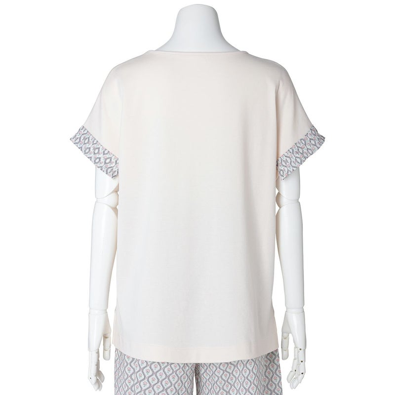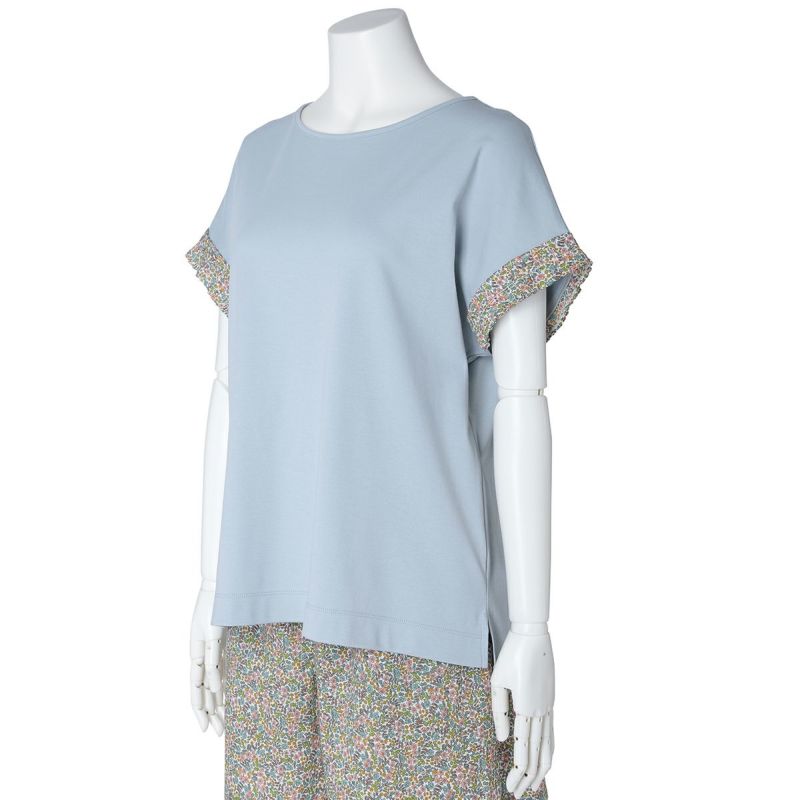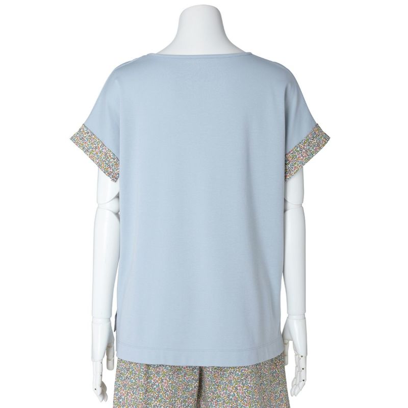 半袖トップスは、袖口に施されたフリルタックがフェミニンなアクセントに。肌あたりを重視し、脇下部分には装飾がないのもうれしいポイント。25LIBERTYプリントのボトム(KOBP145、KOBP545)と合わせて、無地×柄コーディネートもおすすめです!