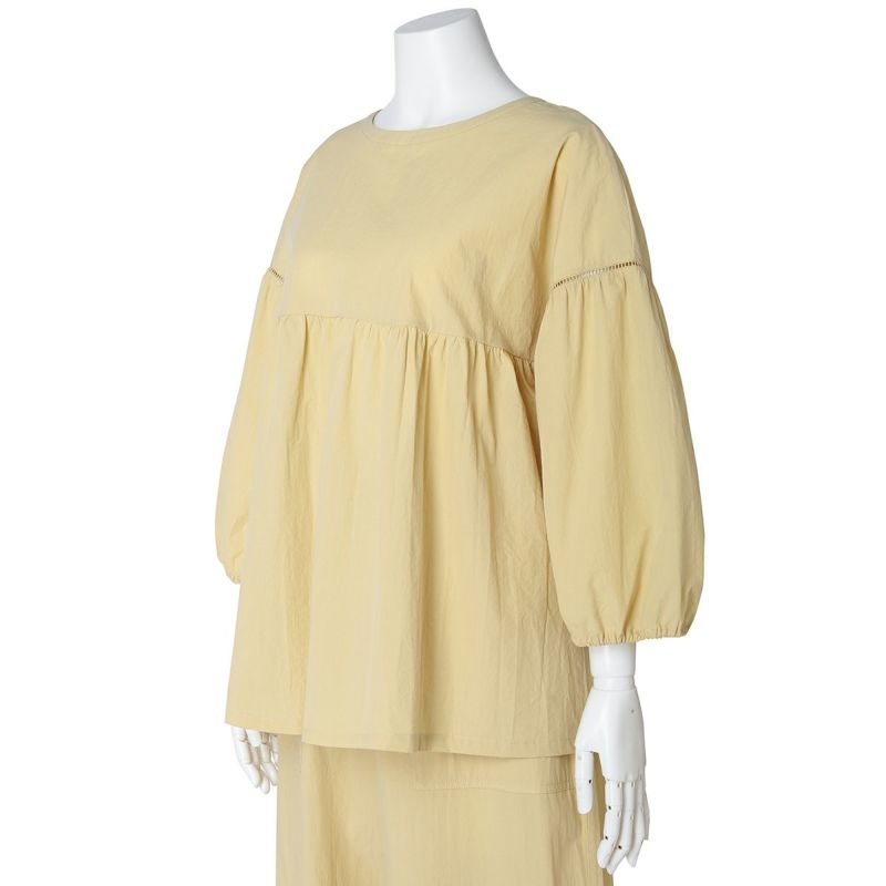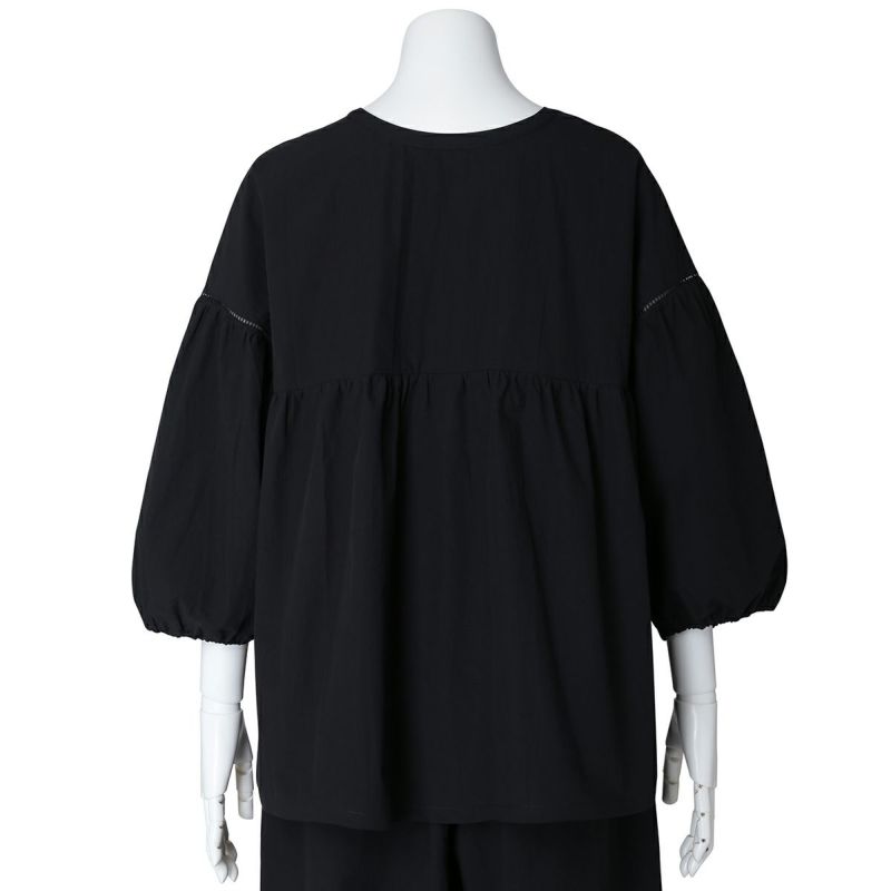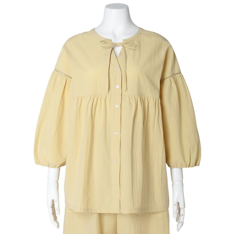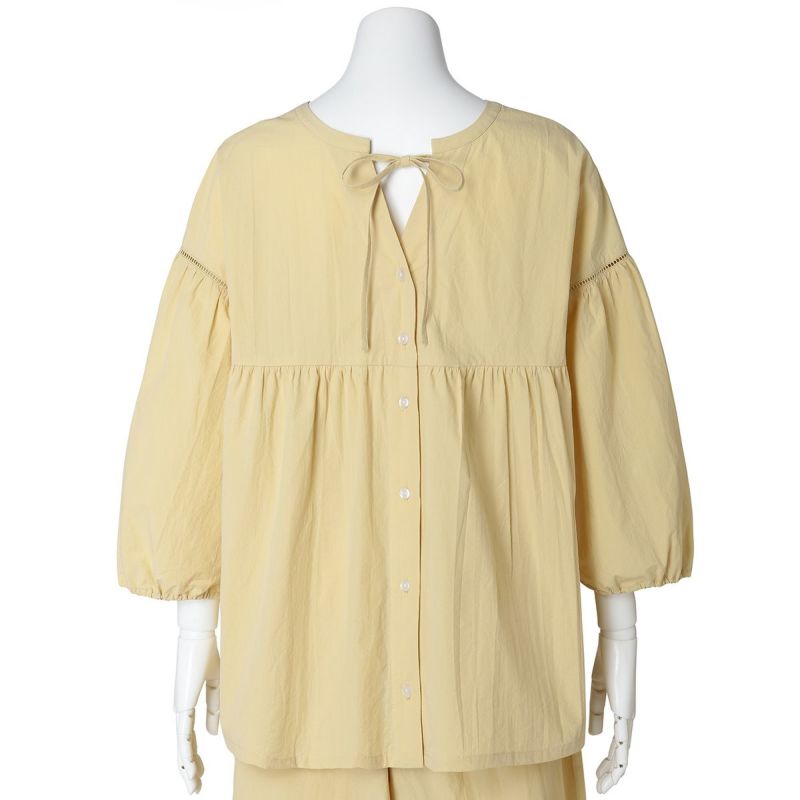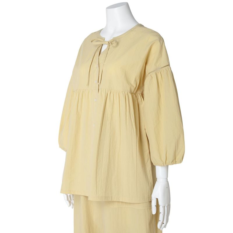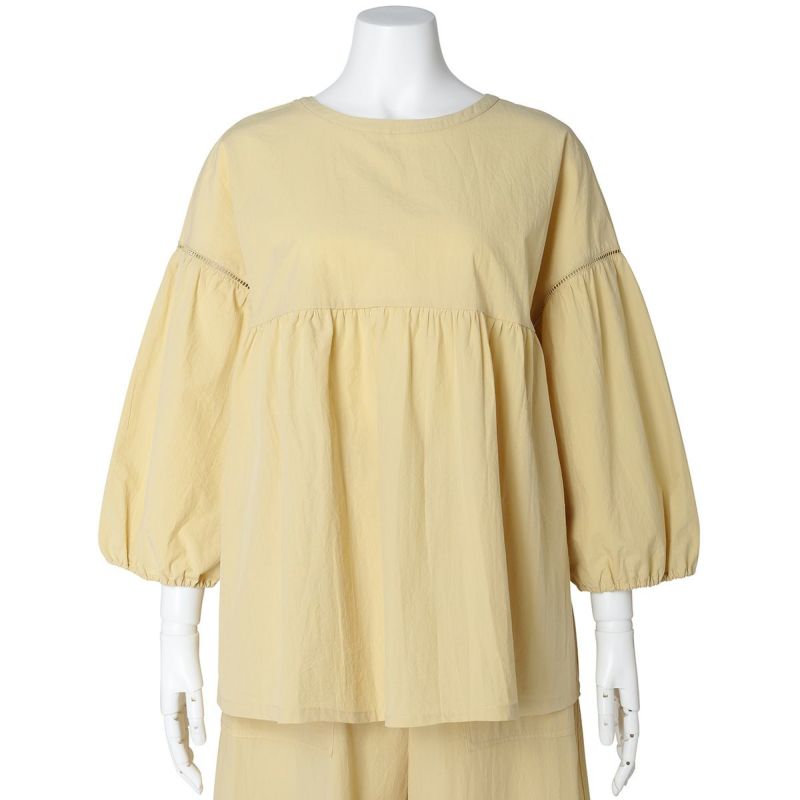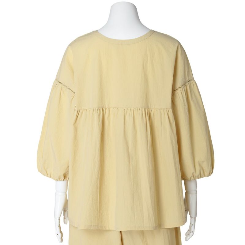 切り替えギャザーでゆったりしたシルエットのトップス。インゴムのややパフスリーブの袖が腕を華奢に見せます。ドロップショルダーの袖をハシゴレースでつなぎフェミニンなポイントに。前後で着られる2WAY仕様でデザイン性も高く、さまざまな着こなしを楽しめます。同素材のボトムス(25ワッシャーコットン フルレングスボトムス)や25LIBERTYプリントショート丈ボトムス(KOBP145)フルレングスボトムス(KOBP545)とのコーディネートがおすすめ。