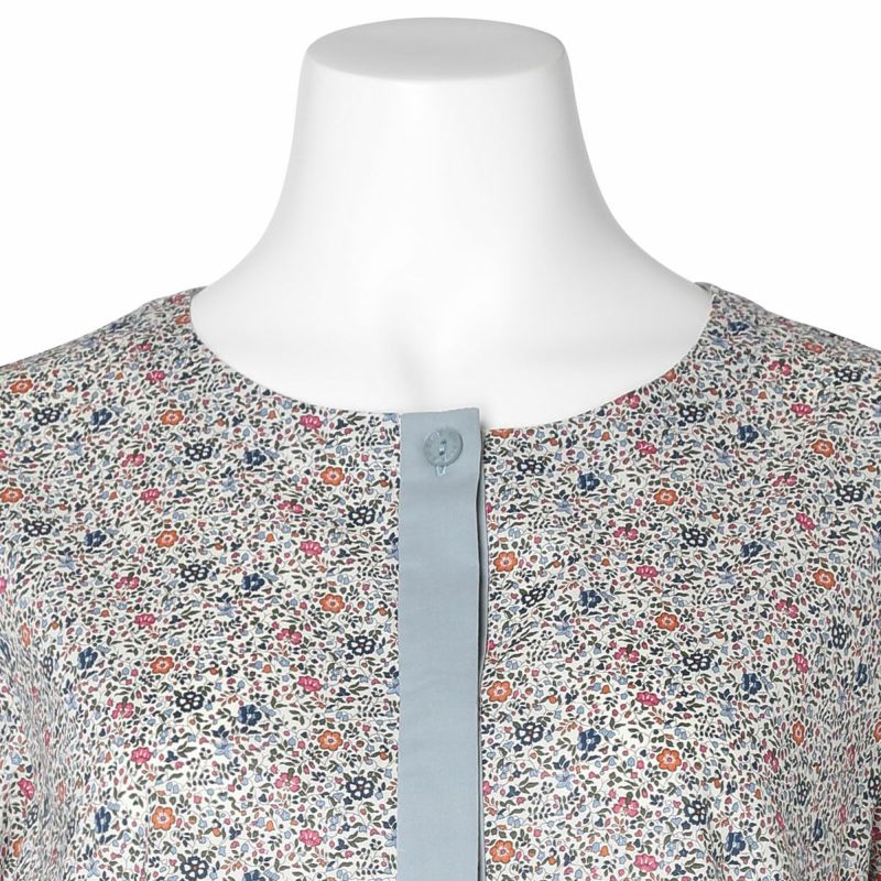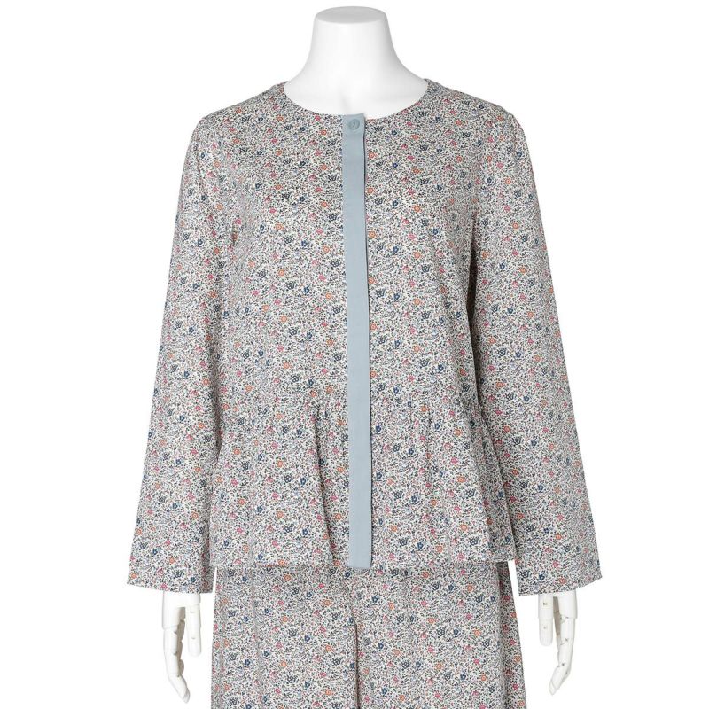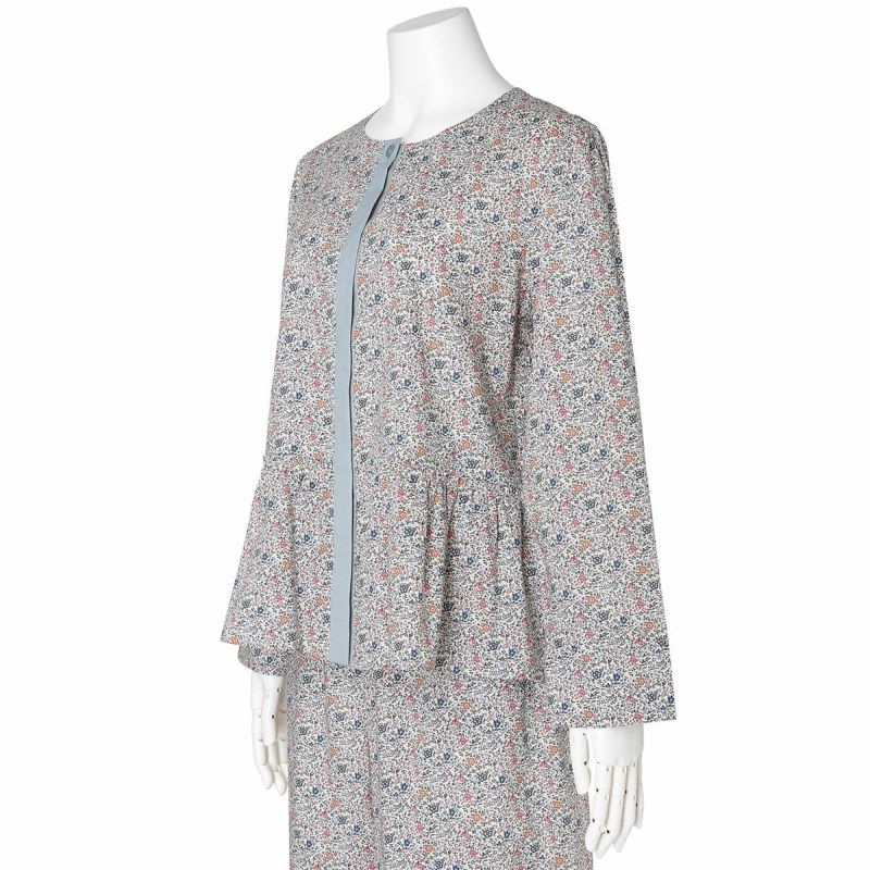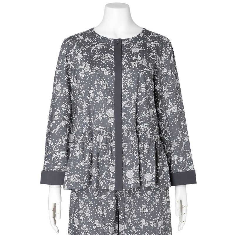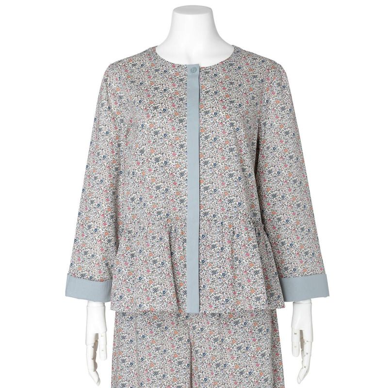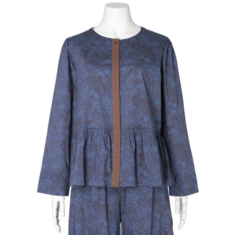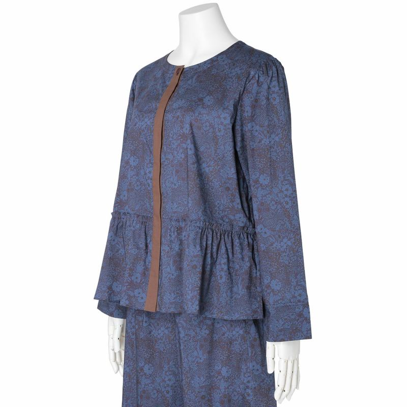 裾のペプラムがフェミニンな長袖トップス。比翼仕立てによりボタンの見えないデザインは品が良くきちんとした印象に。