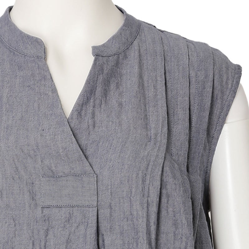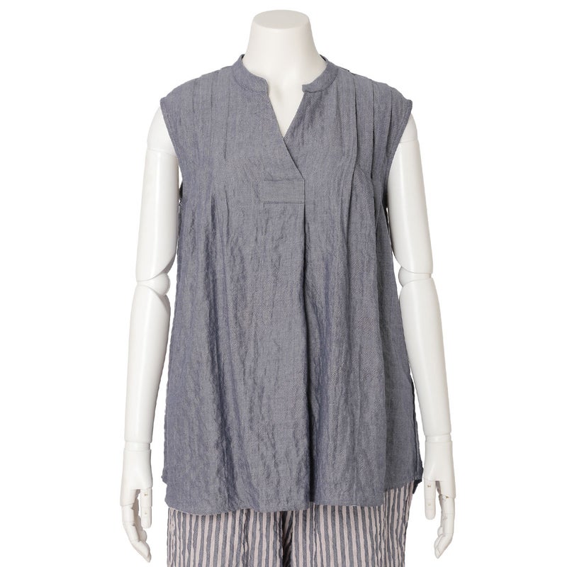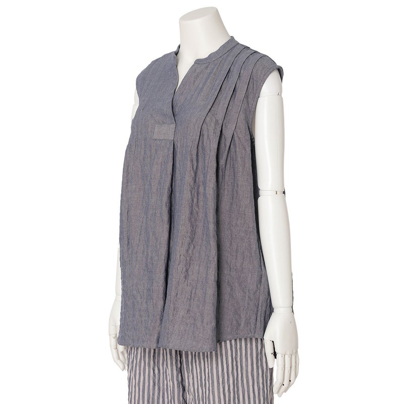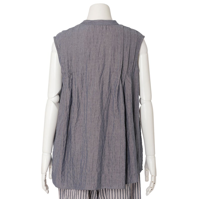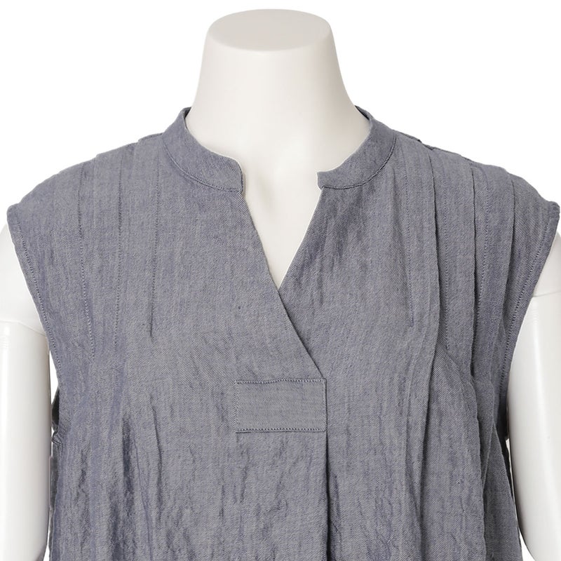 肩からのタックで品よく見せるノースリーブカットソー。裾はカーブラウンドさせたシャツのようなカットのため出してもスタイリングがきまりやすい。同シリーズのボトム(KODP547)とのコーディネイトがおすすめ。