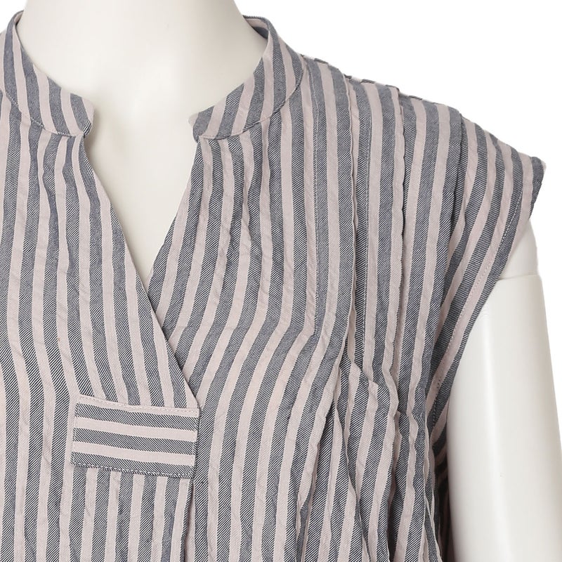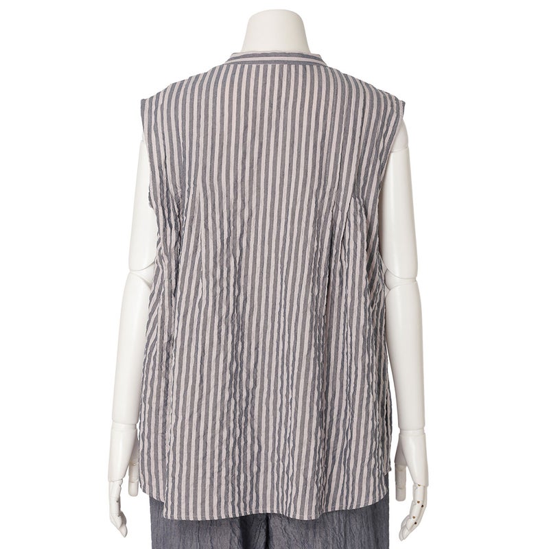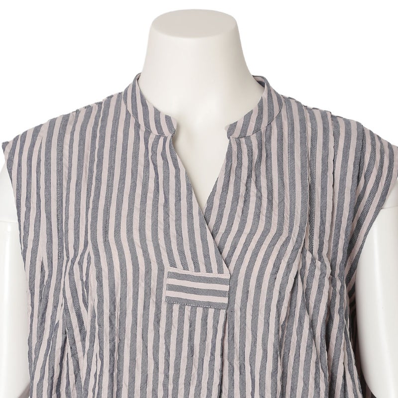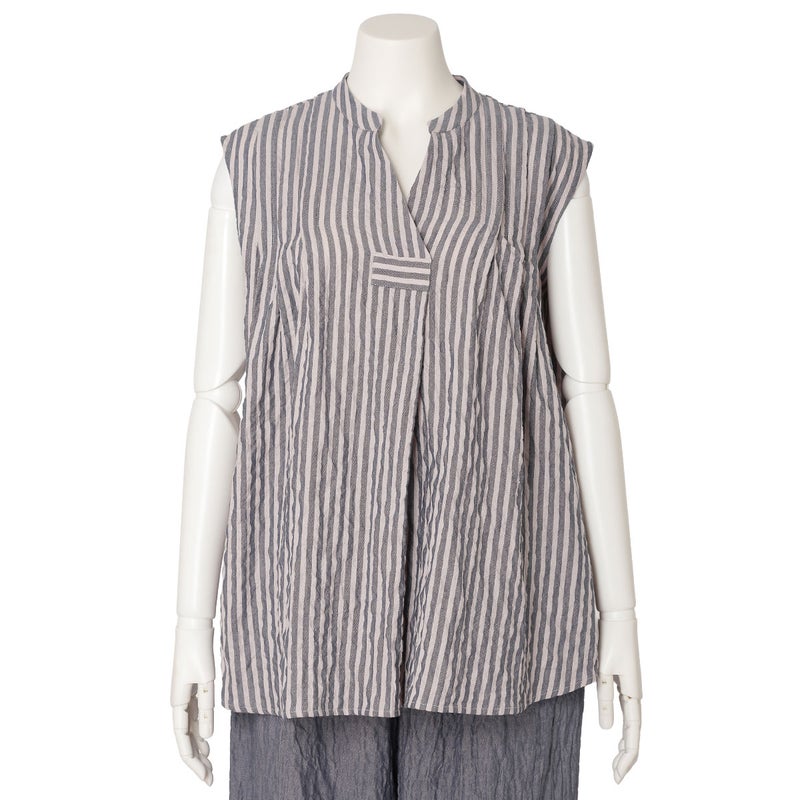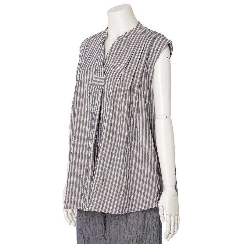 肩からのタックで品よく見せるノースリーブカットソー。裾はカーブラウンドさせたシャツのようなカットのため出してもスタイリングがきまりやすい。同シリーズのボトム(KODP547)とのコーディネイトがおすすめ。