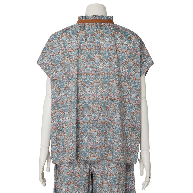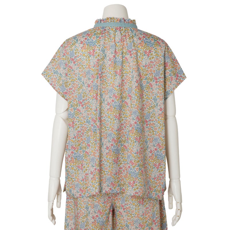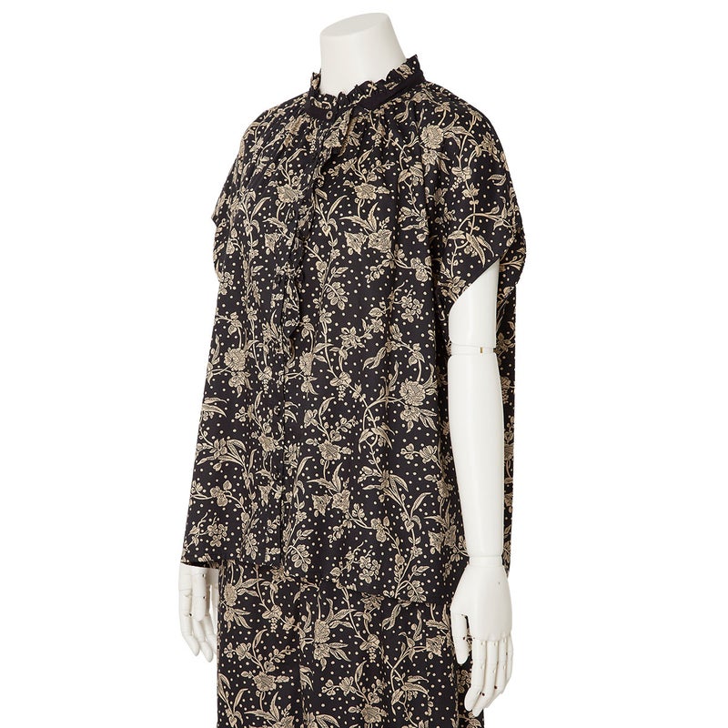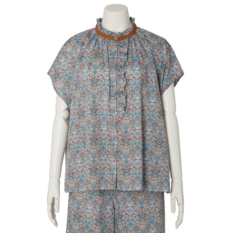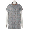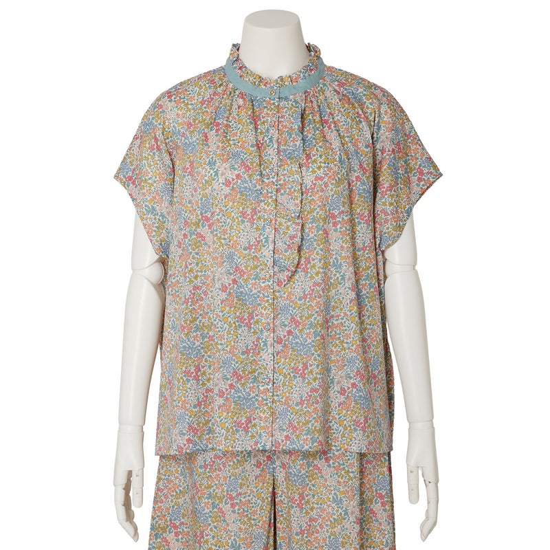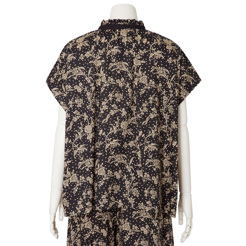 襟元と前立てのフリルが大人の甘さを引き立てるフレンチスリーブトップス。同柄のパンツ(KODP545)とのコーディネイトはもちろん、シンプルなボトムやデニムとも相性が良く、日常の装いを華やかにしてくれます。