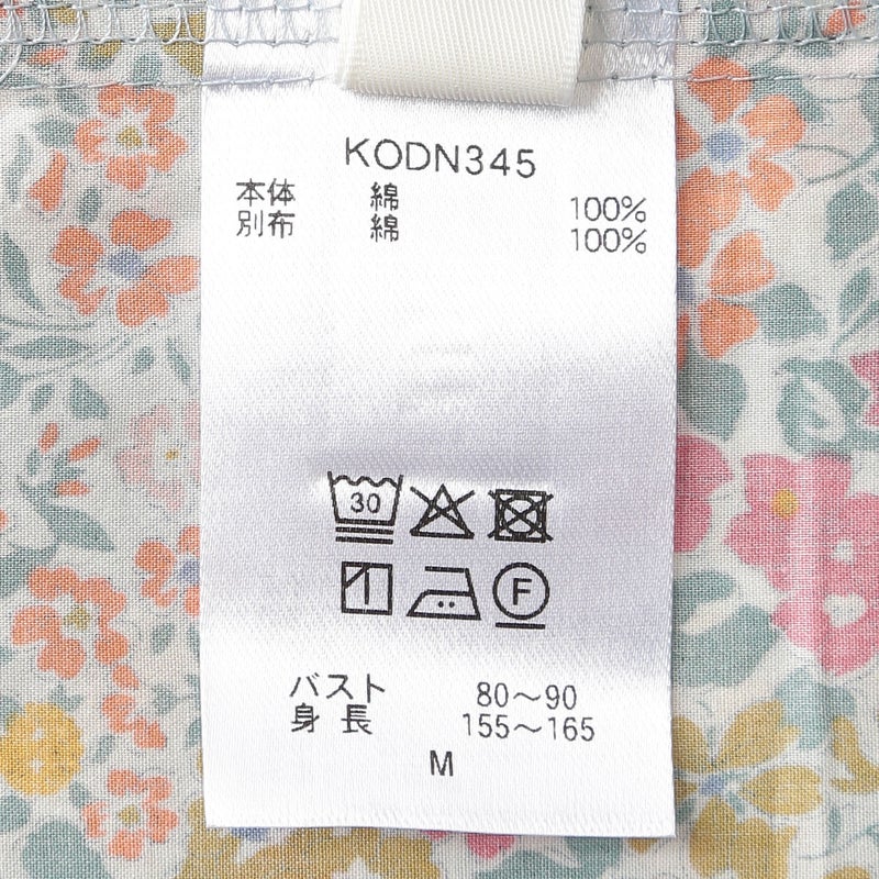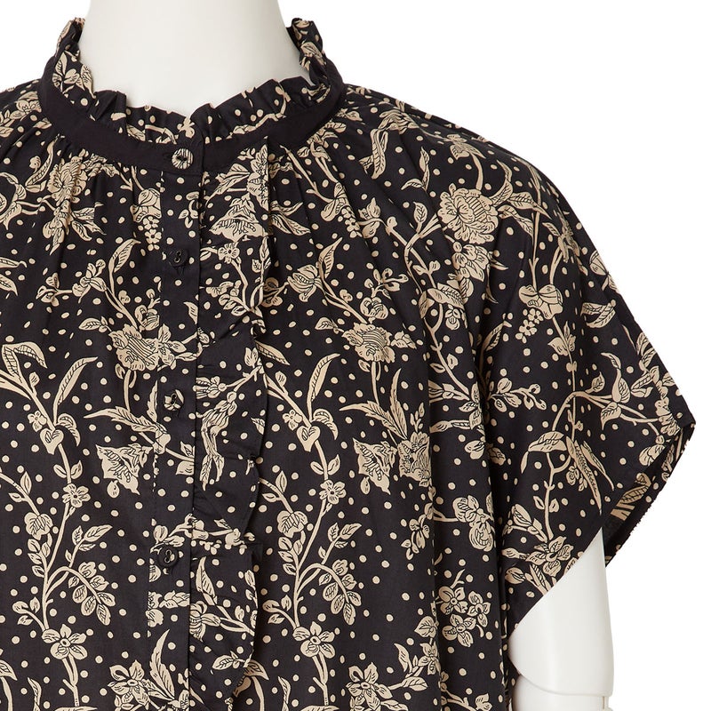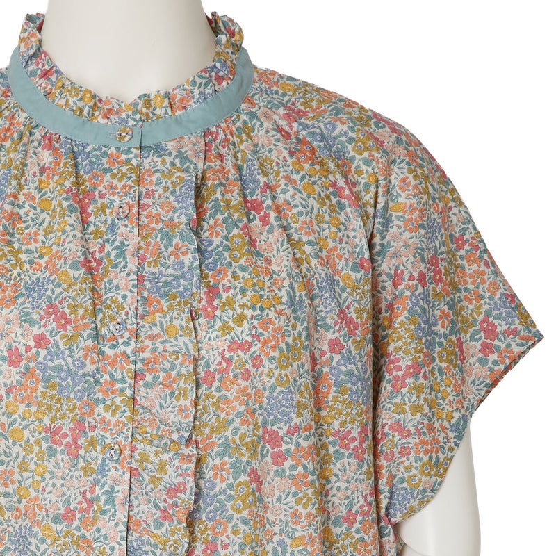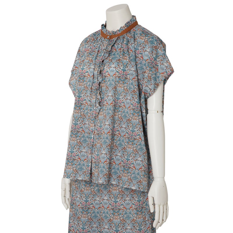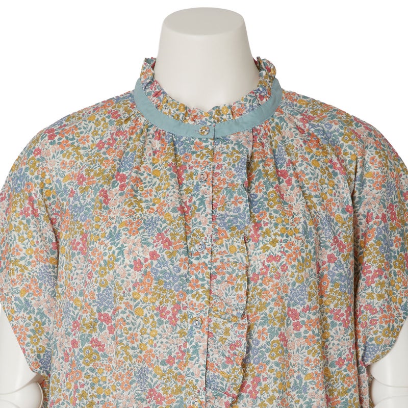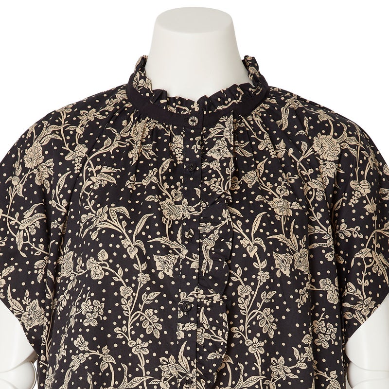 襟元と前立てのフリルが大人の甘さを引き立てるフレンチスリーブトップス。同柄のパンツ(KODP545)とのコーディネイトはもちろん、シンプルなボトムやデニムとも相性が良く、日常の装いを華やかにしてくれます。