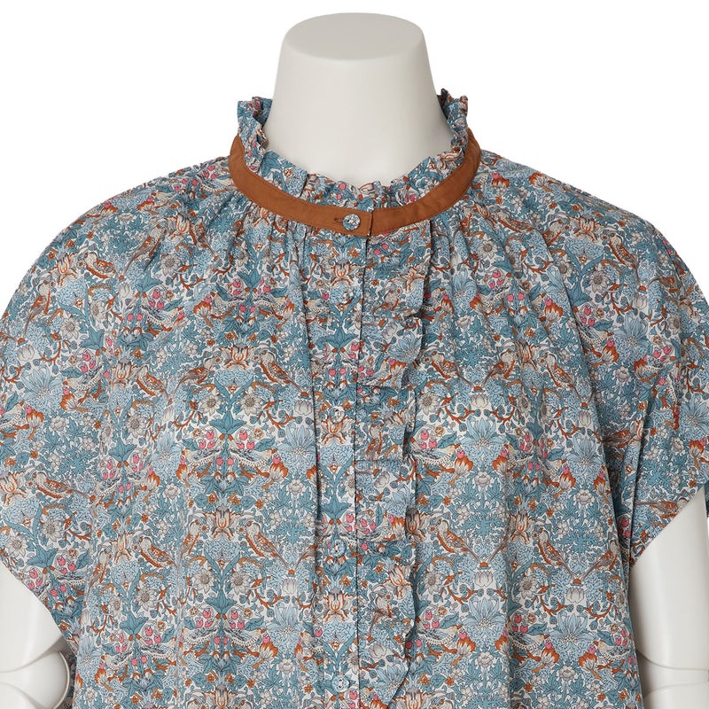 マルチは「ジョアンナ・ルイーズ」隙間なく描かれたルーズなアウトラインのアザミ、ナデシコ、バラ、そしてアフリカホウセンカが魅力的な牧草地のようなボタニカルプリント、ブラックは「マロリー」モノトーンのドットに東洋の花が描かれ甘すぎずシックに着こなせる。サックスは「ストロベリー・シーフ・スプリング」ウィリアム・モリスによる「いちご泥棒」と名付けた鳥と苺のモチーフにストーリーを感じる柄。