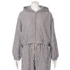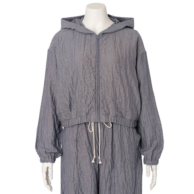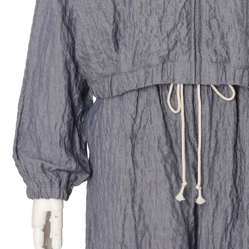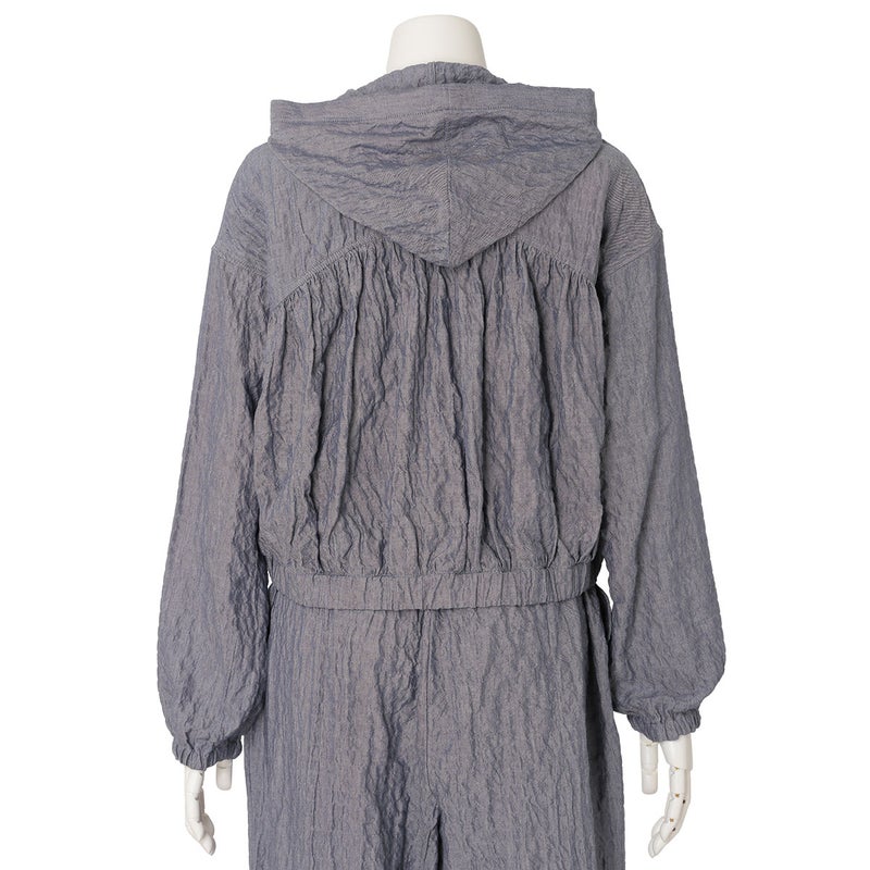 シャーリングシャンブレーの表情が魅力のワンマイルウエアシリーズ。表面に表情のある凹凸感が肌に心地よい柔らかな質感を生み出します。素材には木の実由来の天然繊維「カポック」を混紡しました。綿の約1/8という軽さを吸放湿性を兼ね備えたカポックはシルクのような光沢と肌触りが特徴。環境負荷の少ない素材として注目されている素材です。元々ニュアンスのあるシャーリング素材のため旅行や移動などにもおすすめです。