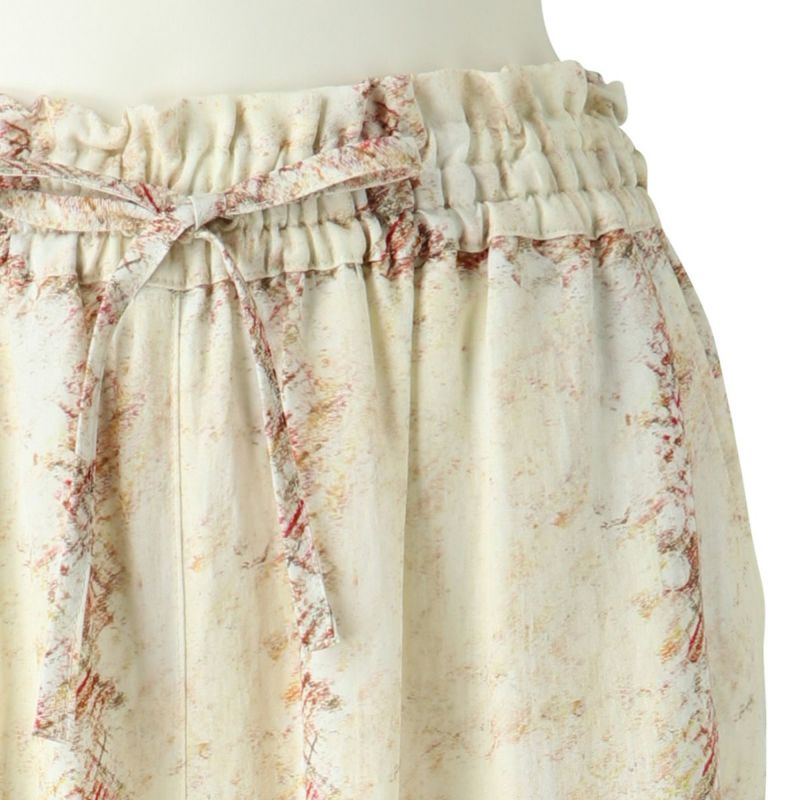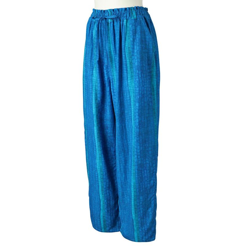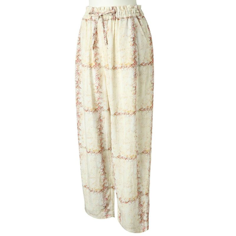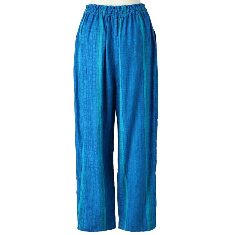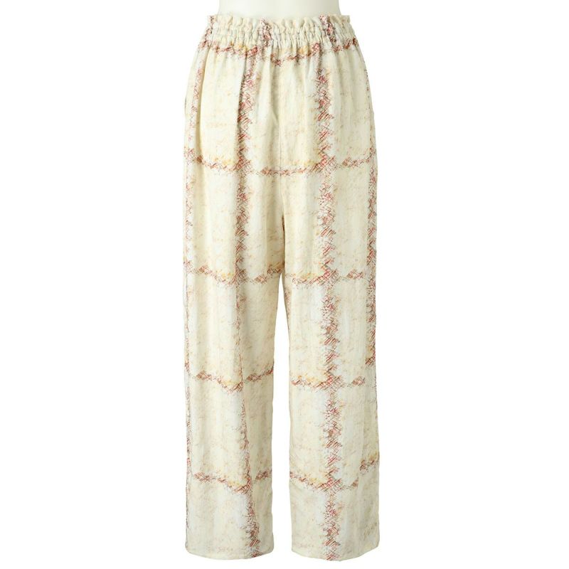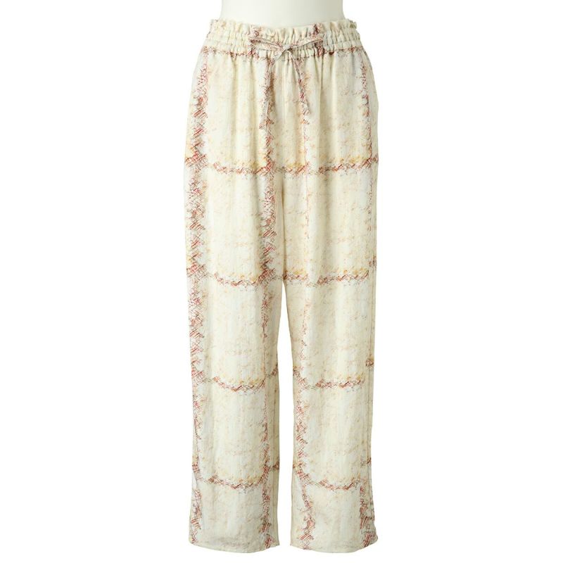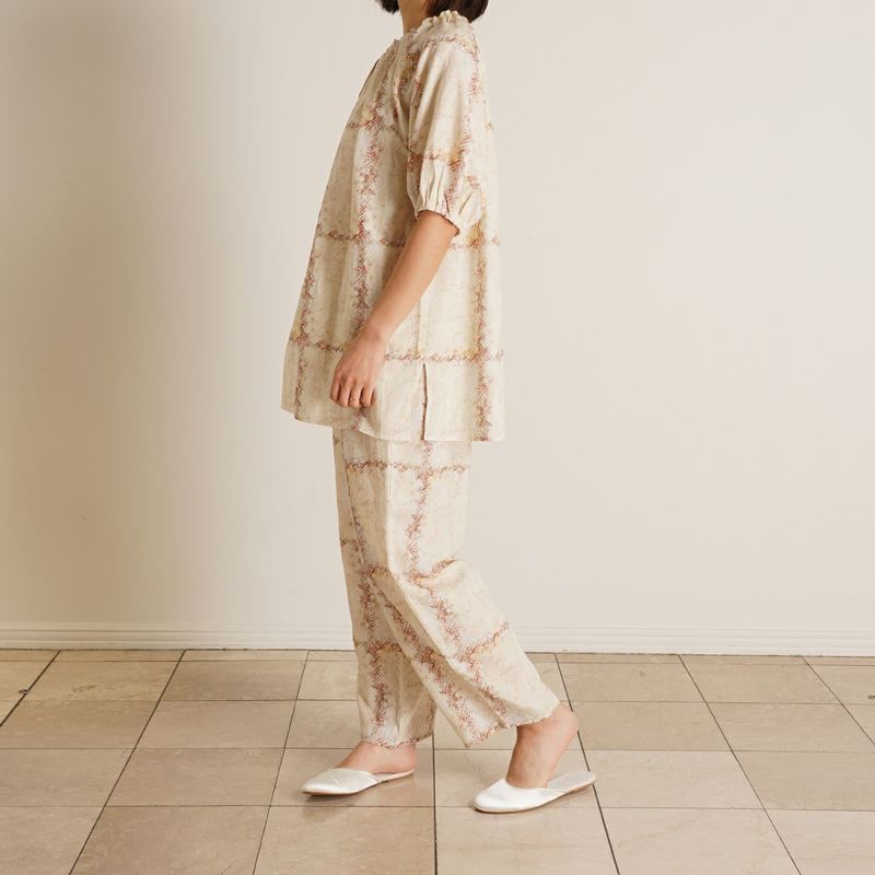 くるぶし丈ボトムスは、ウエストにギャザーをよせたテーパードシルエット。同柄のトップスとコーディネートも、シンプルなトップスにも映える。