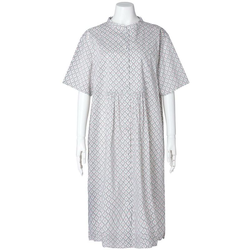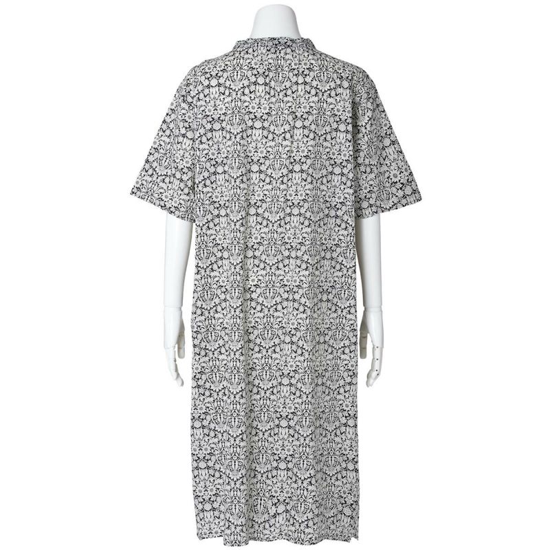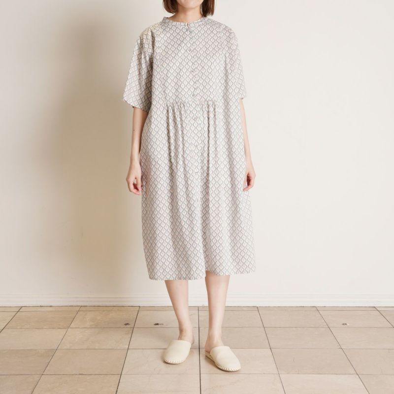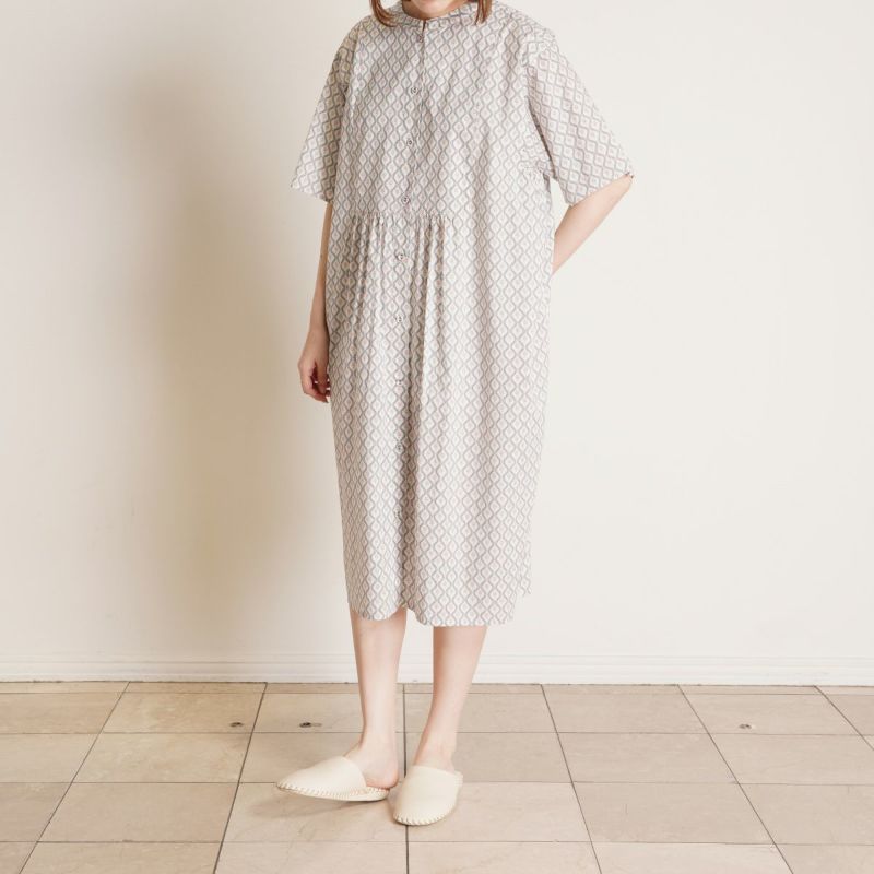 5分袖ワンピースは、身幅をとったシルエットながらヨークやギャザーで洗練された印象。体型を気にせずリラックスした着心地を実現しました。前ボタンを開けて羽織として着こなしても。ボタンも共地のクルミで丁寧に仕立て。このまま一枚でも、同柄のパンツ(KOBP145,KOBP545)はもちろん、25ワッシャーコットン フルレングスボトムス(KOBP546)とのコーディネイトもおすすめ。
