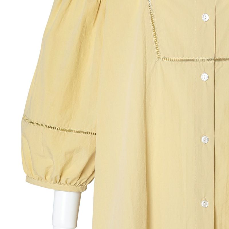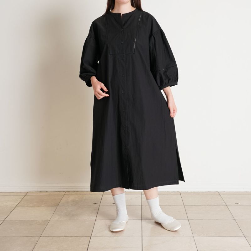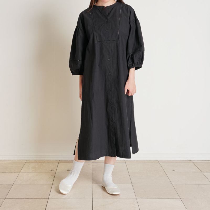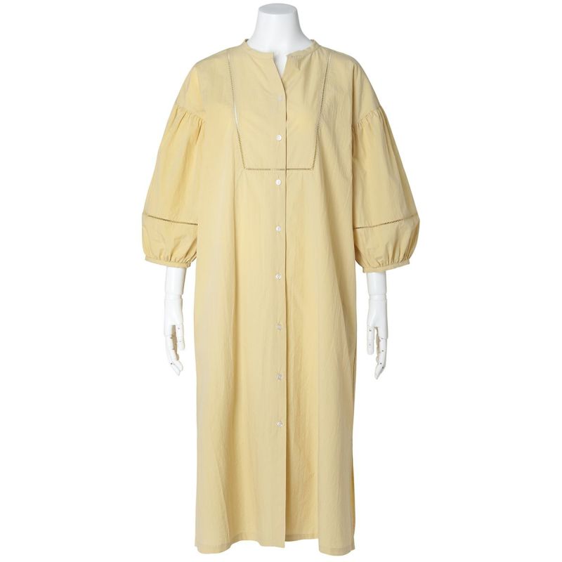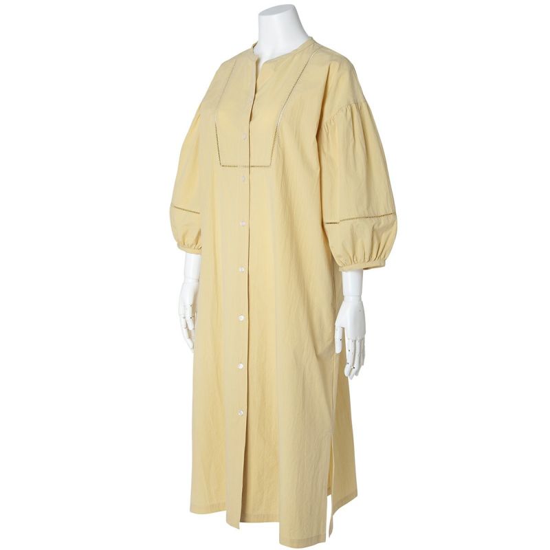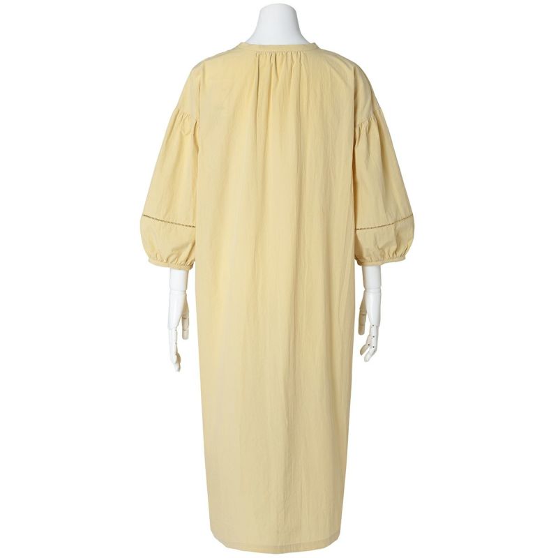 8分袖ワンピースは、ふんわりと広がるパフスリーブが魅力の一枚。アクセントとなるヨーク切り替えと袖口のハシゴレースがフェミニンなポイント。首元はすっきり見せるキーネック。同素材のボトム(25ワッシャーコットンフルレングスボトムスKOBP546)や 25LIBERTYプリントのボトム(KOBP545)と合わせたコーディネートや、ボタンを開けて羽織としての着こなしもおすすめです◎