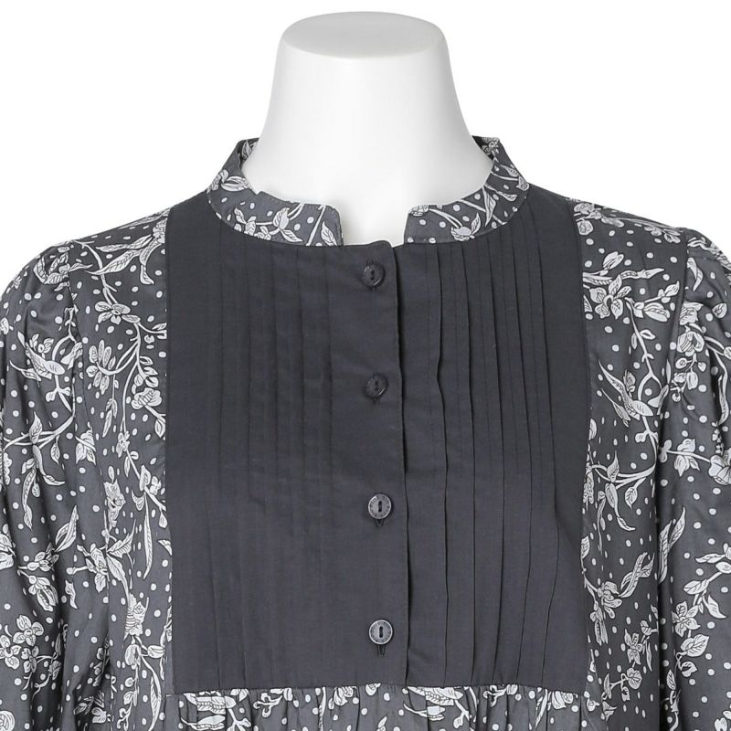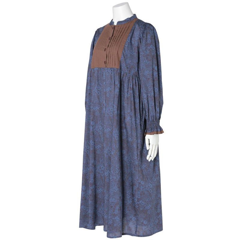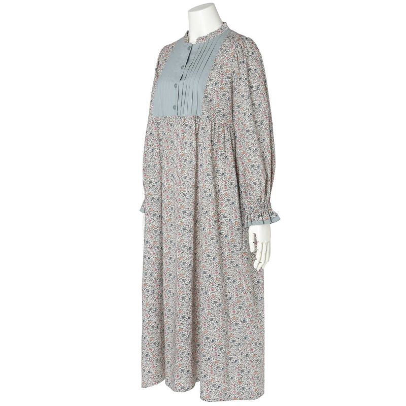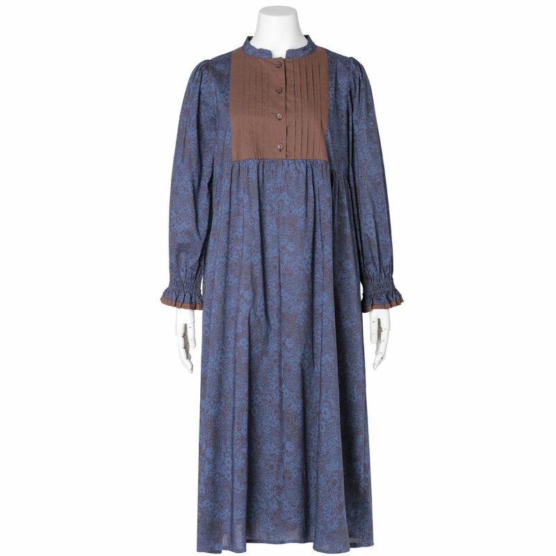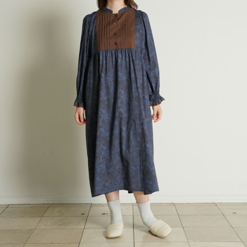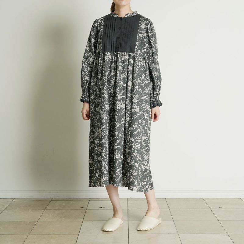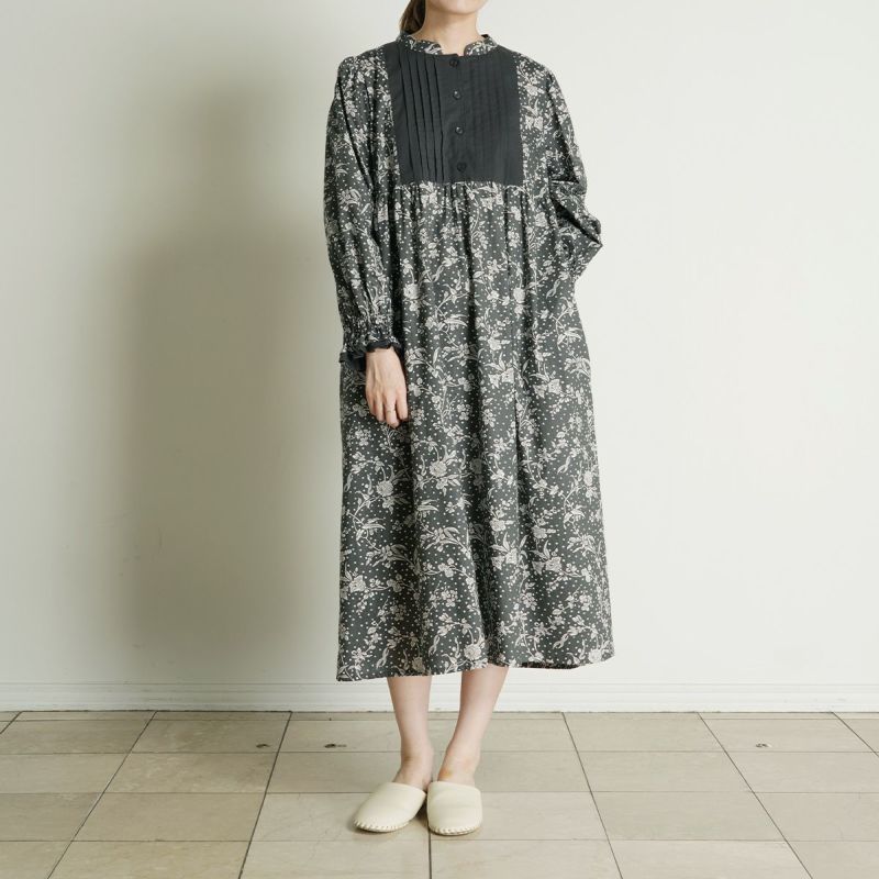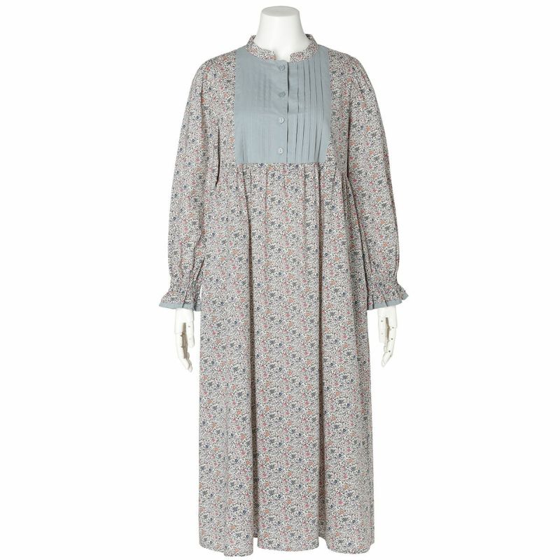 たっぷり入れた前見頃のピンタックがポイントの長袖ワンピース。袖はインゴムのパフスリーブでかわいらしさをプラス。