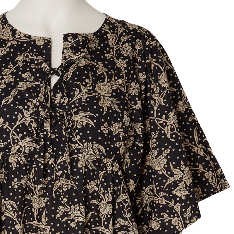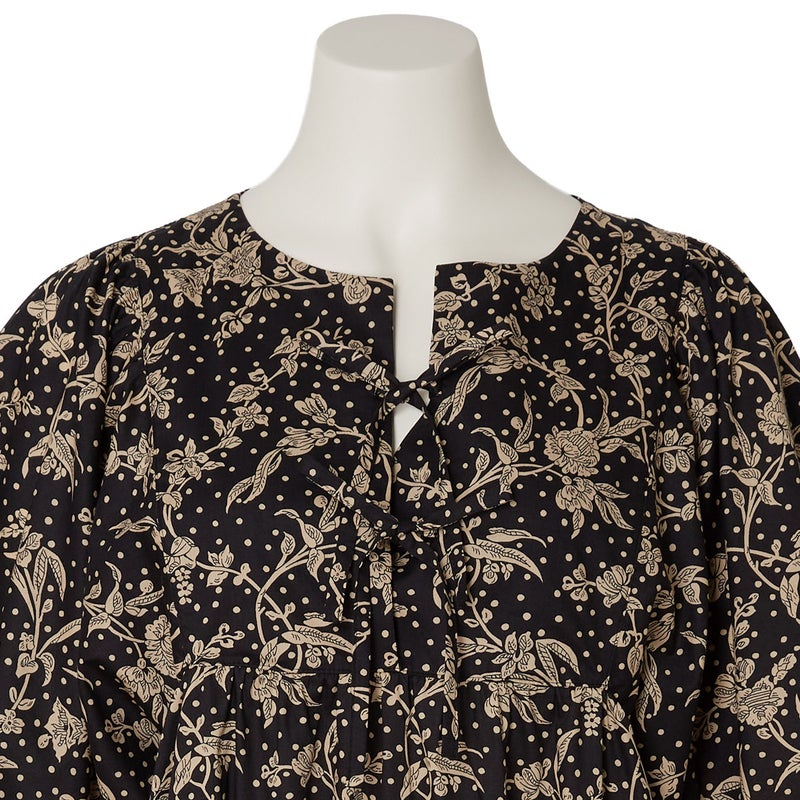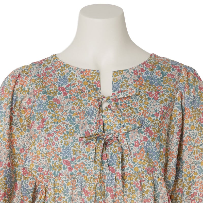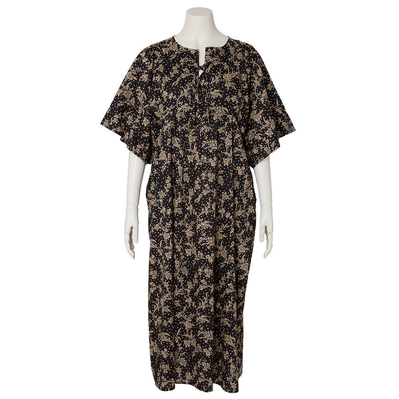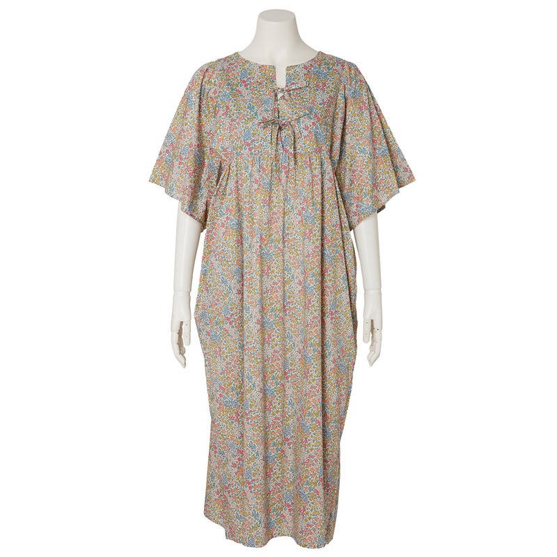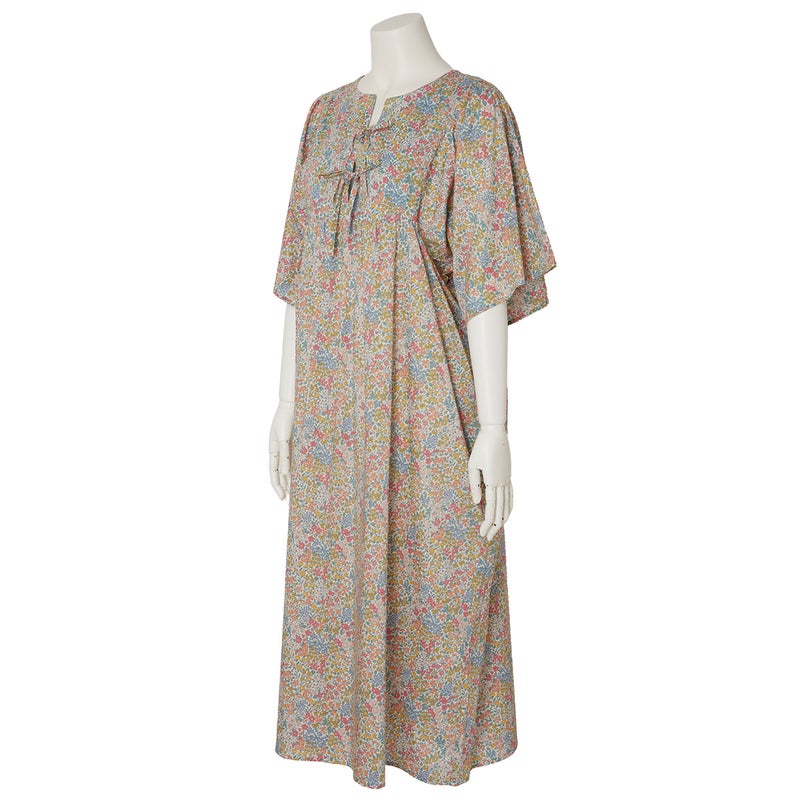 総柄の華やかなワンピースはフロントのダブルリボンで大人の甘さを品よく引き立てる。肩より内側から袖へとつながるデザインは肩まわりが楽な着用感。五分袖できになる二の腕をさりげなくカバーしてくれるのもポイントです。