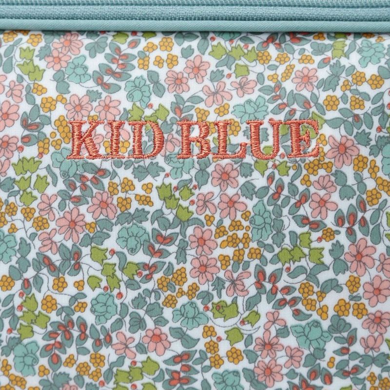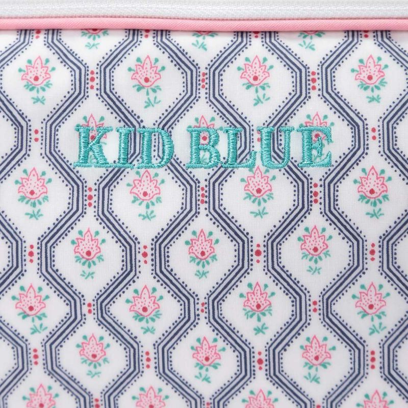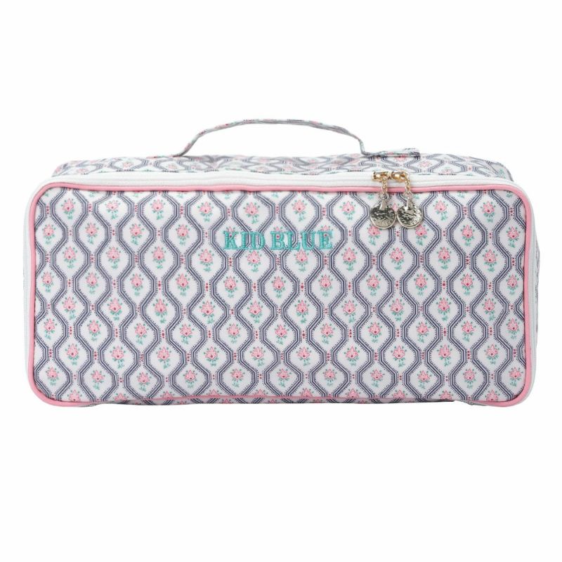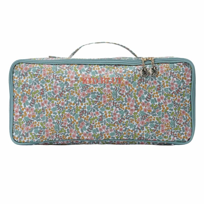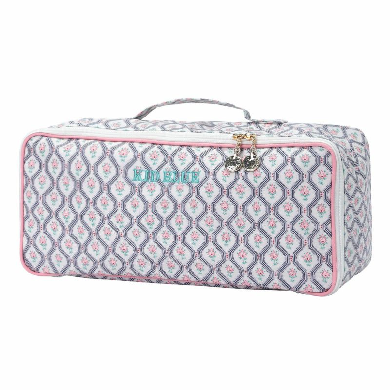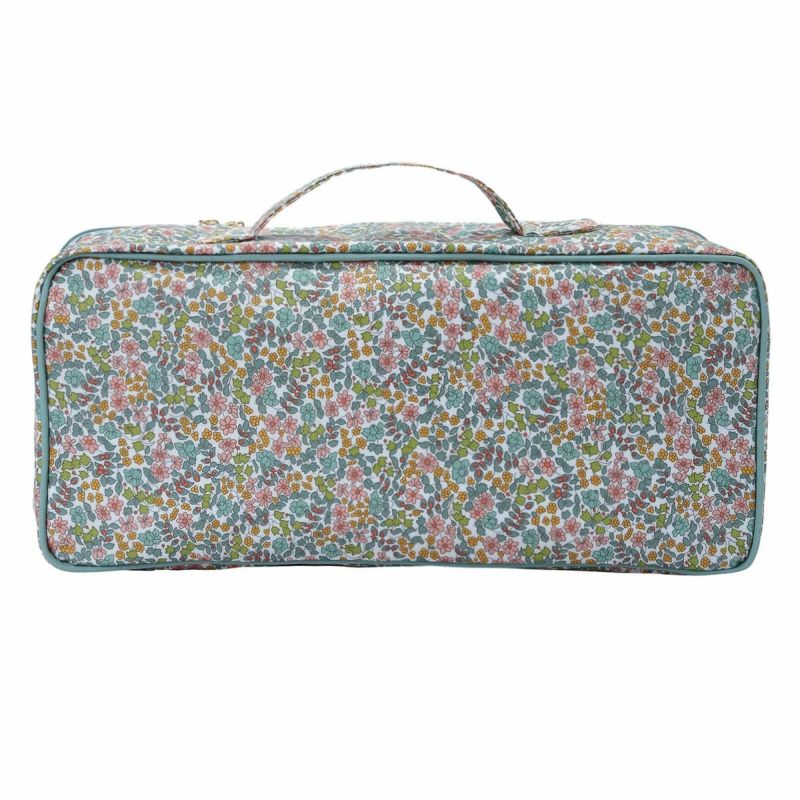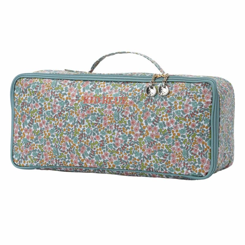 LIBERTYプリントをラミネート加工したランジェリーケース。縦幅を短くし、マチを大きくした横長タイプ。スーツケースや旅行鞄にも収まりやすいサイズ感に。下着だけでなく身の回り品なども入れて持ち運べます。巾着つき。