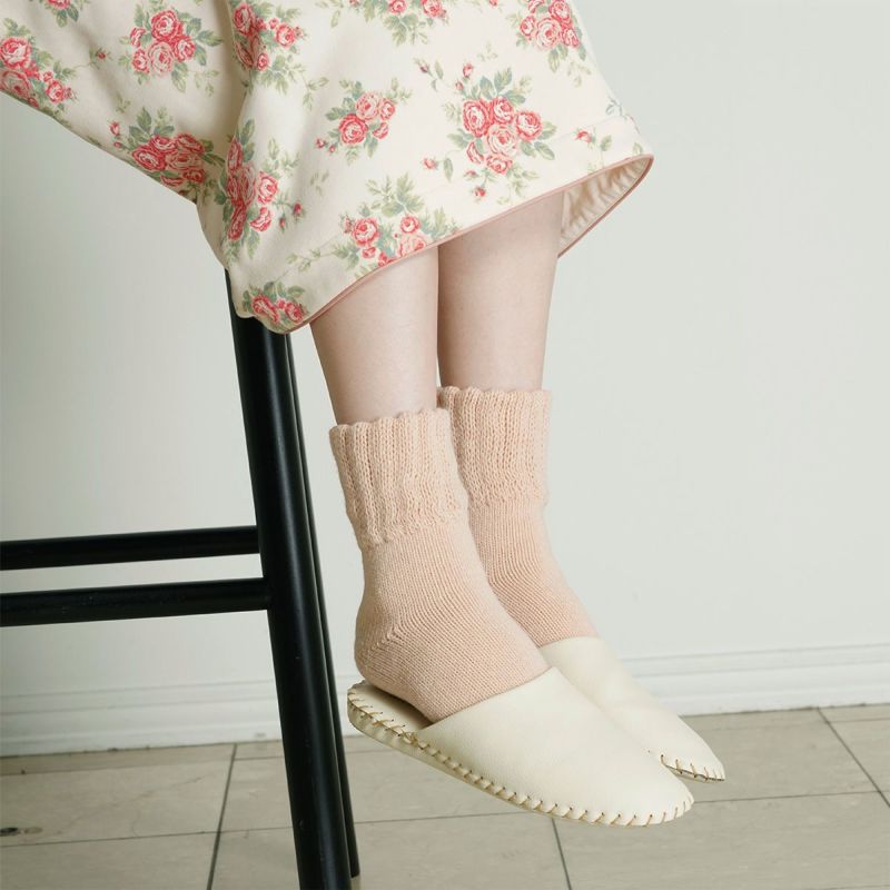 内側にシルクを使用した二重編みソックス。ふっくらとした編地が空気を含み、やさしいあたたかさで足元を包み込みます。シルクならではのなめらかな肌ざわりで、乾燥しやすい冬の素肌にも安心。冷えやすい足先をしっかり守り、冬のルームコーデに欠かせないアイテムです。