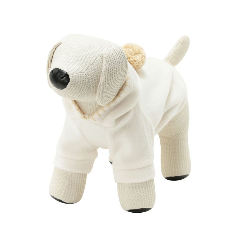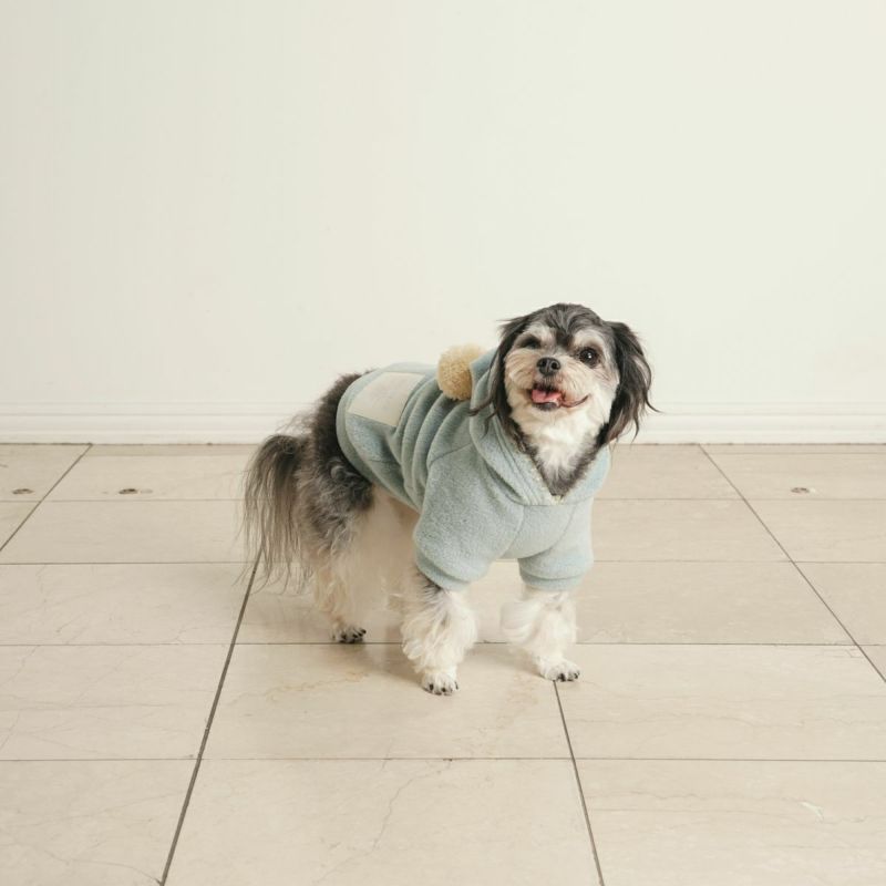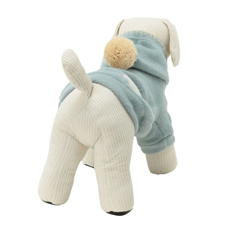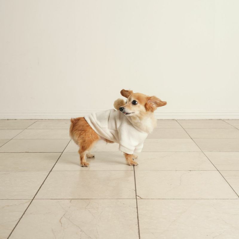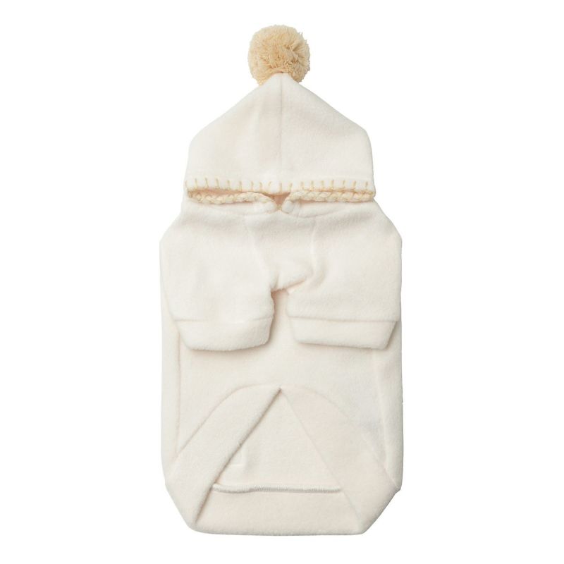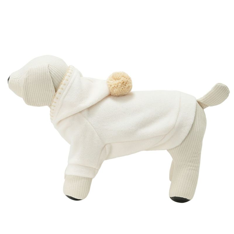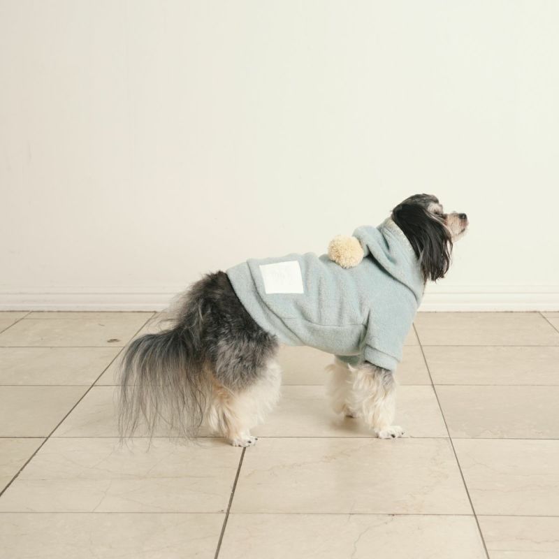 フード周りのブランケットステッチがかわいらしい。ポンポンやロゴネームもポイント。飼い主様とのペアコーデも楽しめます。