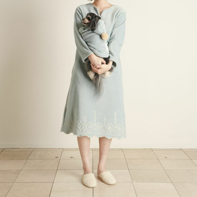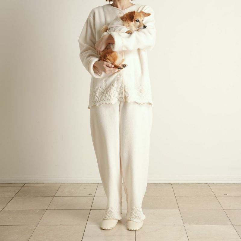 レース柄のような刺しゅうモチーフが素敵なフリースシリーズ。あたたかく軽く着やすい、キッドブルー冬の定番素材。レーヨン混のフリースはしなやかで滑らか。ソフトなあたかみのある印象のアイボリーとユーカリの2色展開。