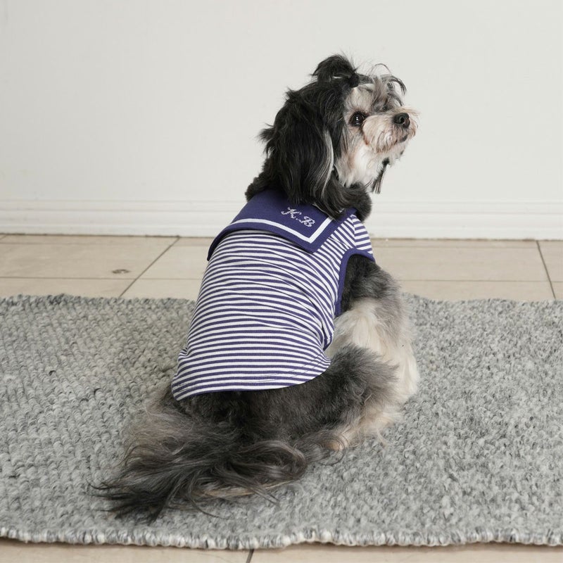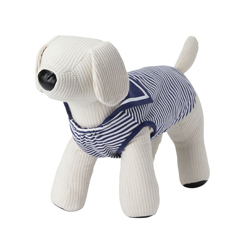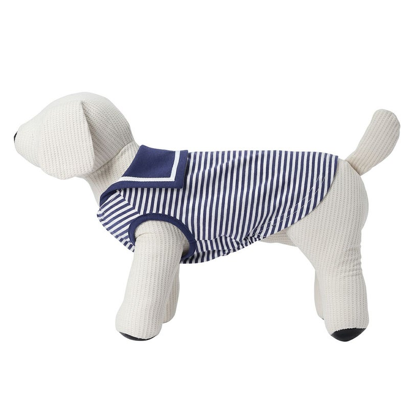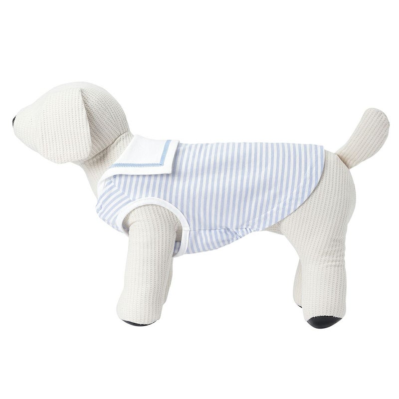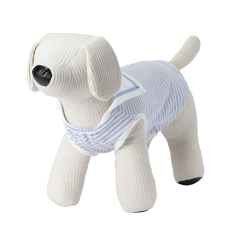 セーラーカラーがかわいらしいドッグウエア。薄手ながらも透けにくく軽く型崩れしにくい新素材。清涼感のあるサックスとブルーの2色展開。