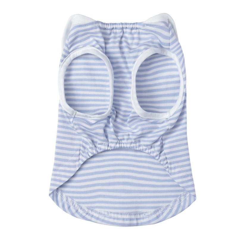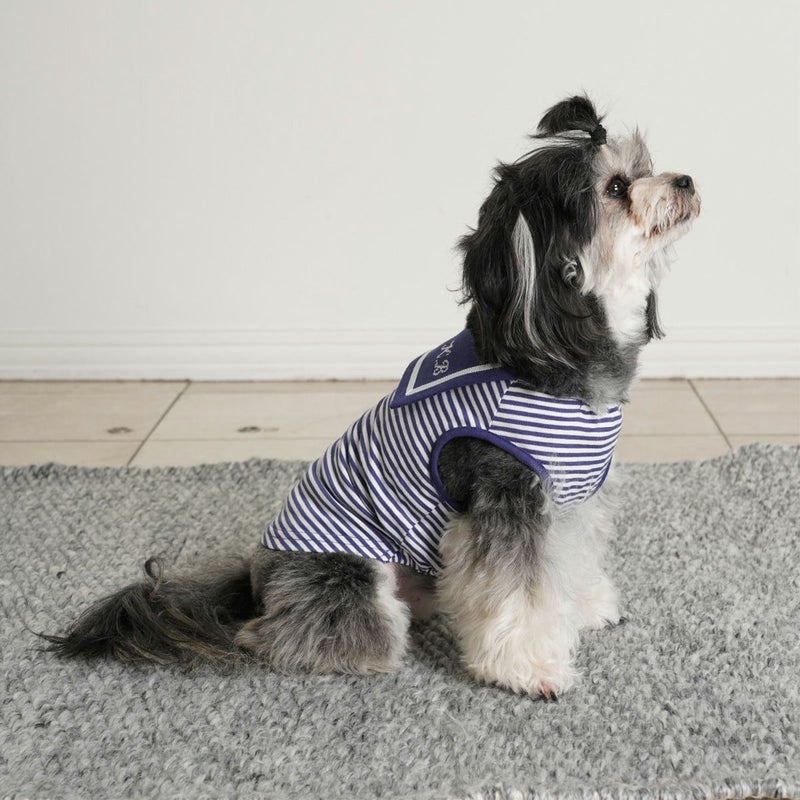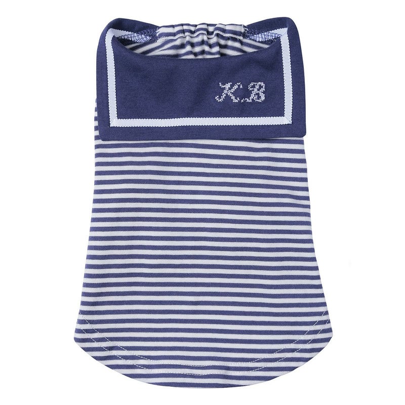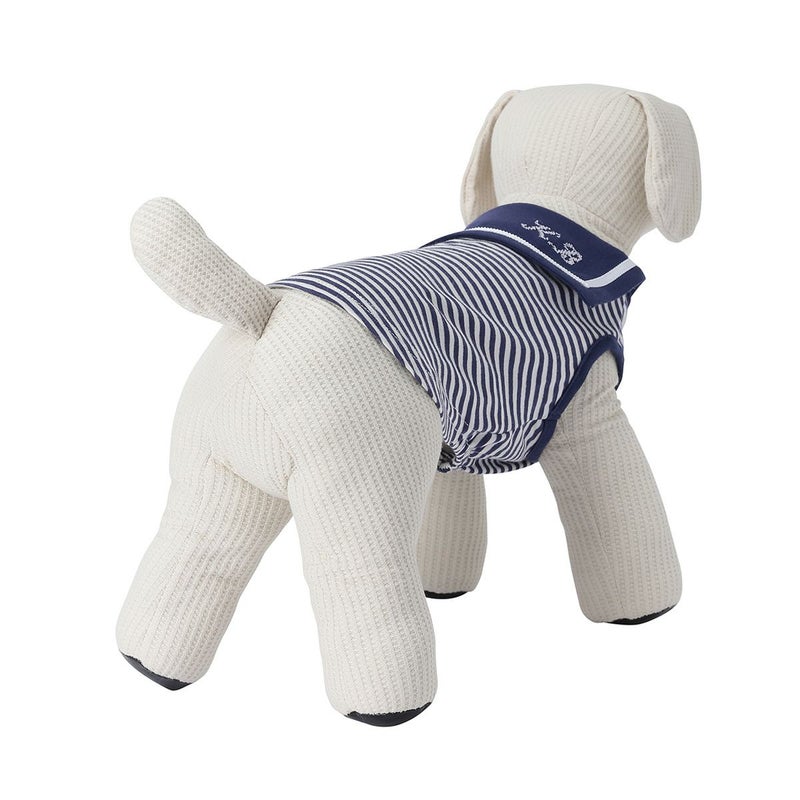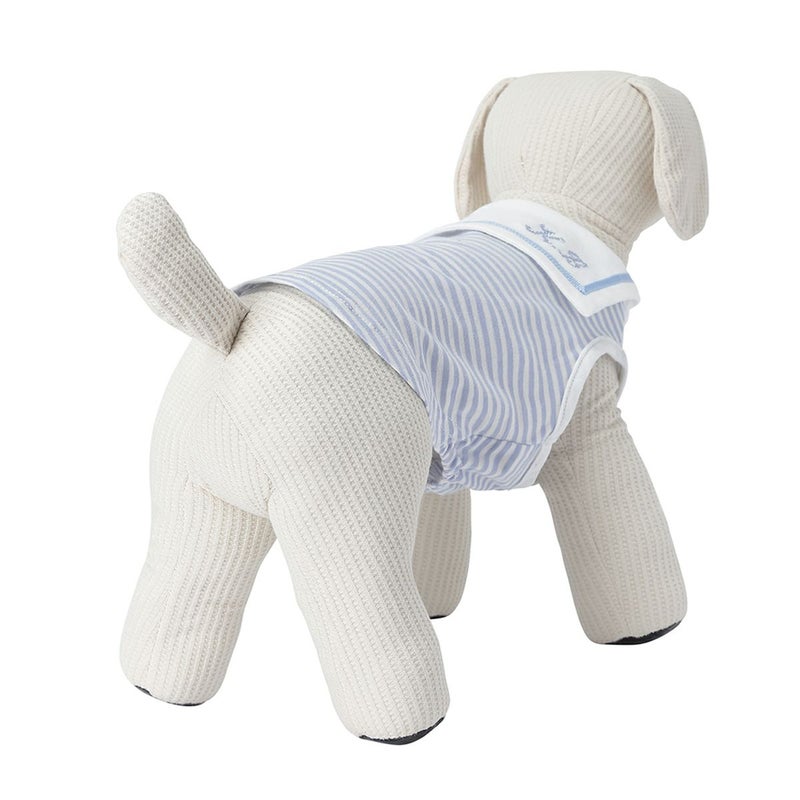 セーラーカラーがかわいらしいドッグウエア。薄手ながらも透けにくく軽く型崩れしにくい新素材。清涼感のあるサックスとブルーの2色展開。