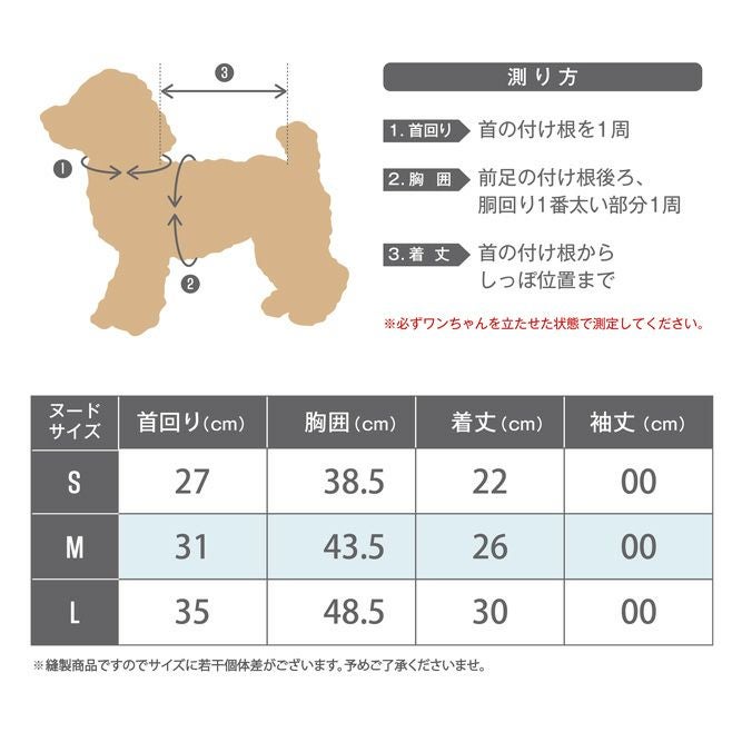 Mサイズ:首回り31cm、胸囲43.5cm、着丈26cm