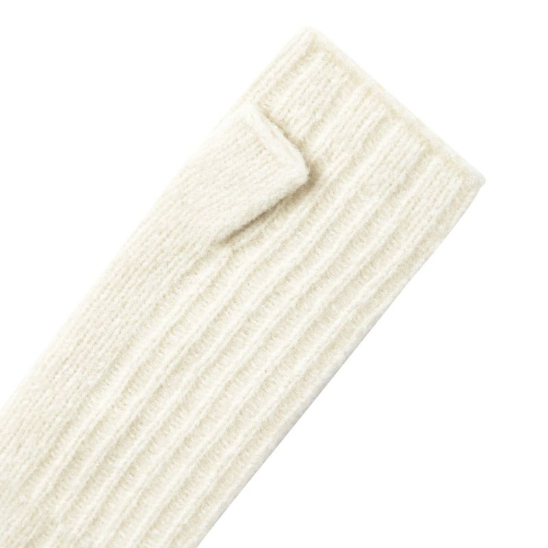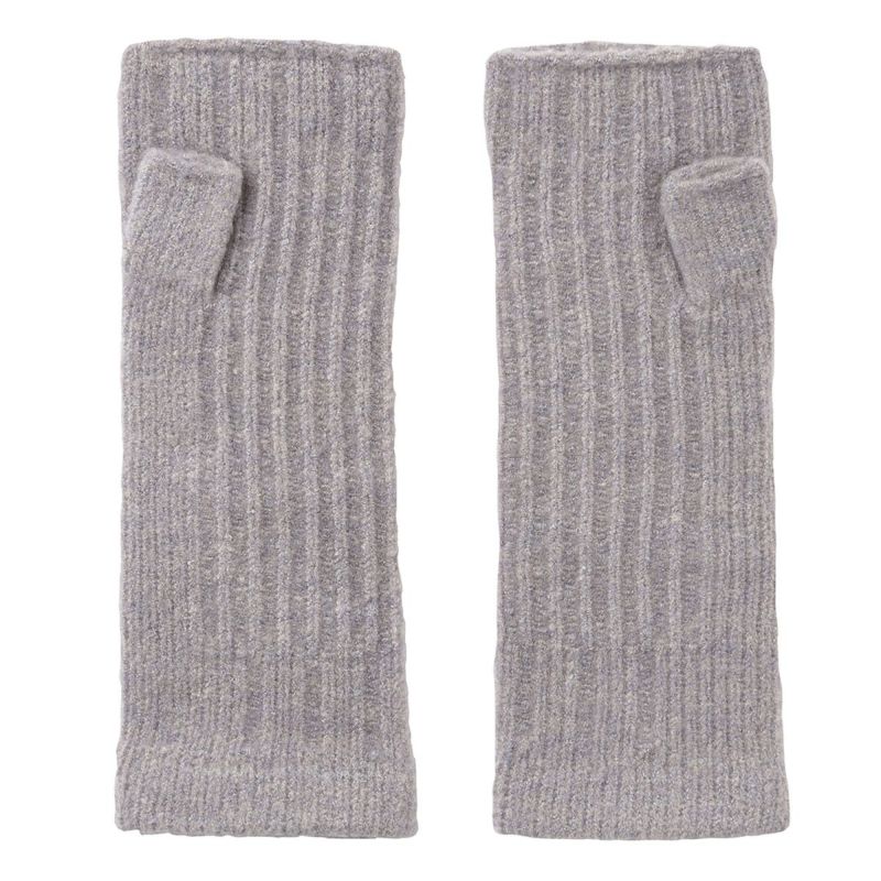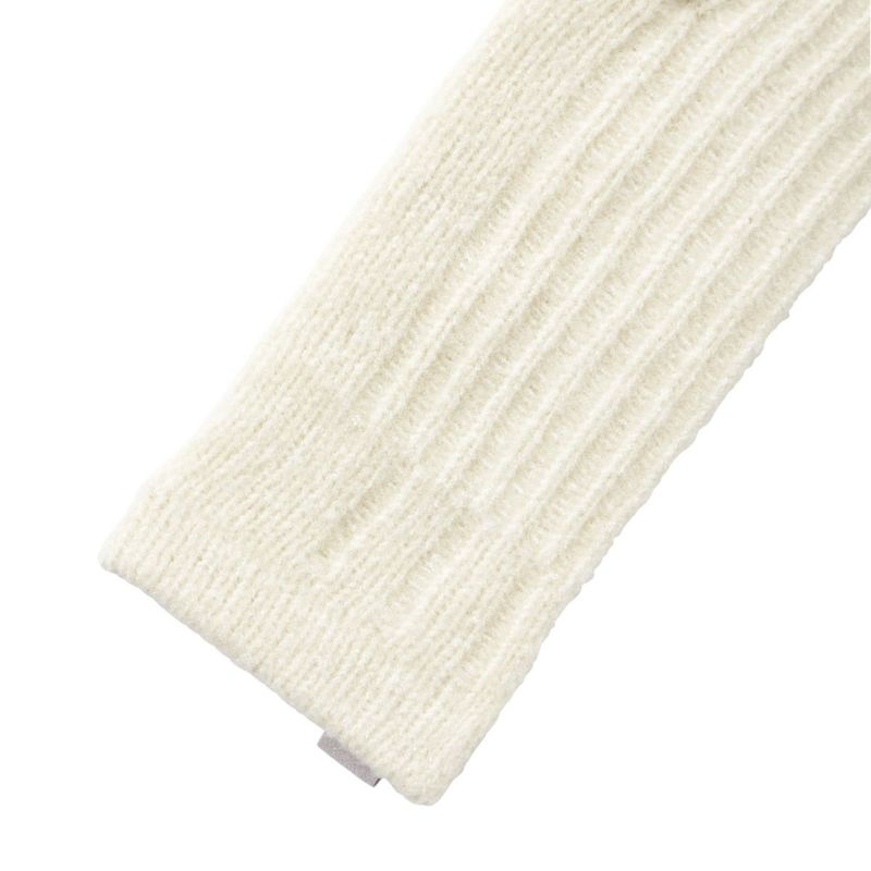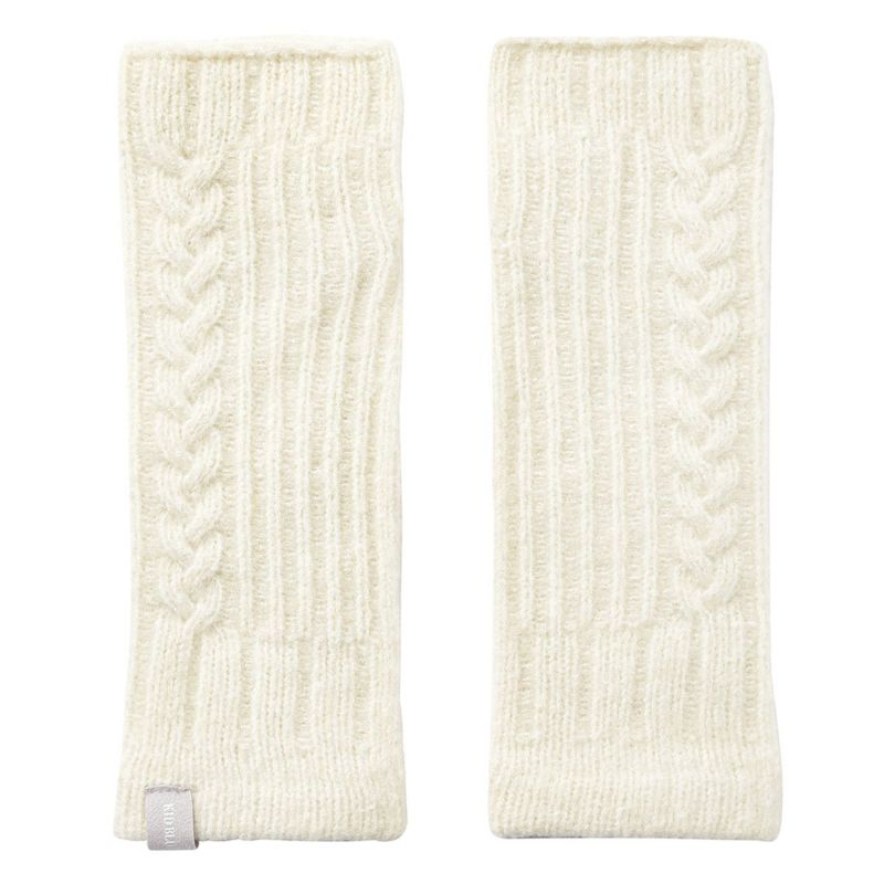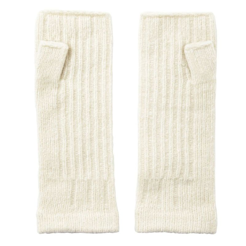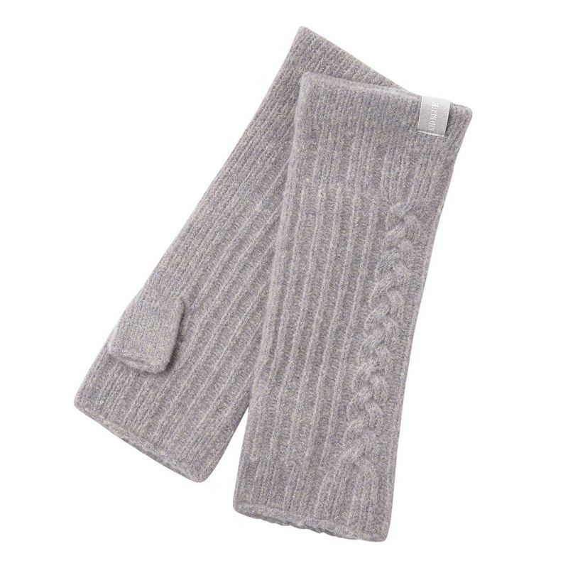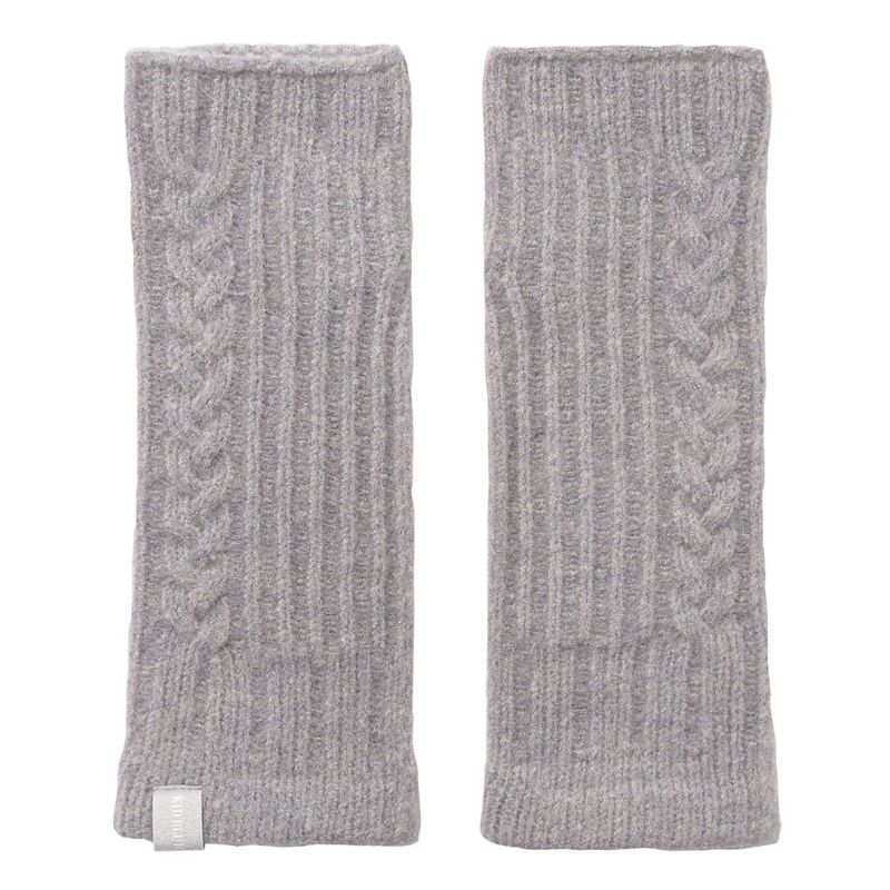 甲部分にケーブル編み模様をあしらった、やさしい雰囲気のニット手袋。指先が出るハンドウォーマータイプ。