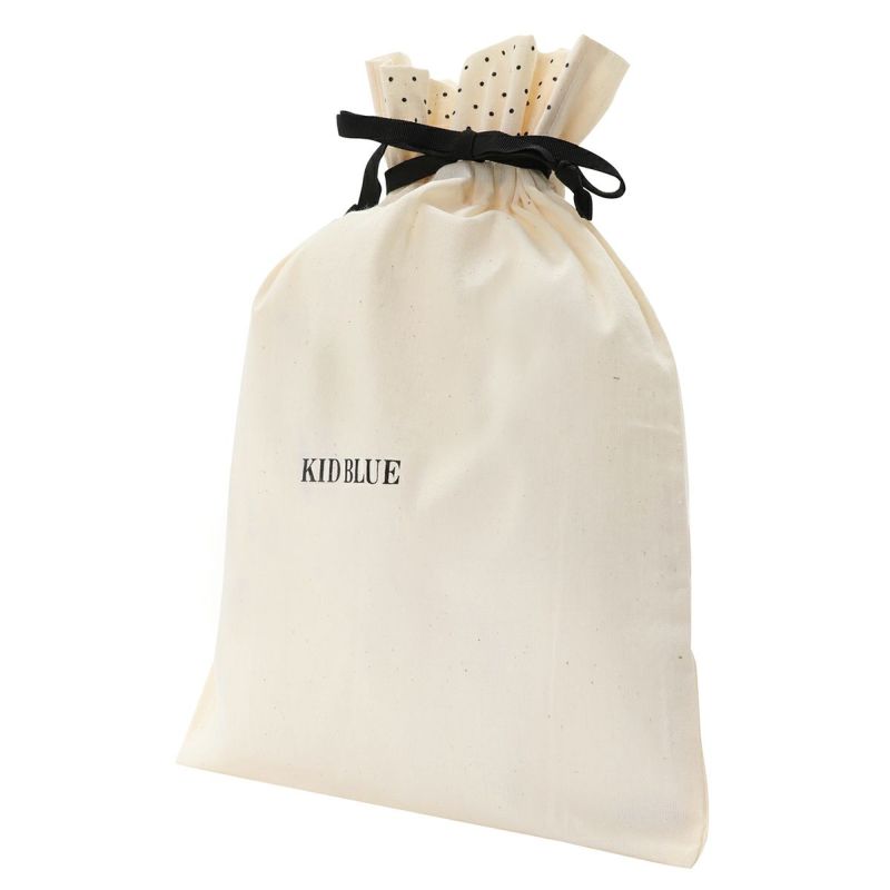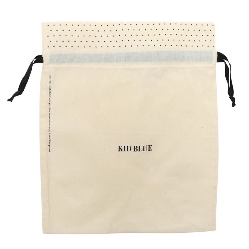大人っぽいナチュラル素材のシーチングにKIDBLUEロゴがポイントになるデザインのギフトにお使いいただける巾着で、リユースも可能です。参考サイズ ・ブラジャー+キャミソール+ショーツのセット・薄手のトップ、ボトム 各1点ずつ・ポーチ、ソックス、フェイスタオルなどのグッズ