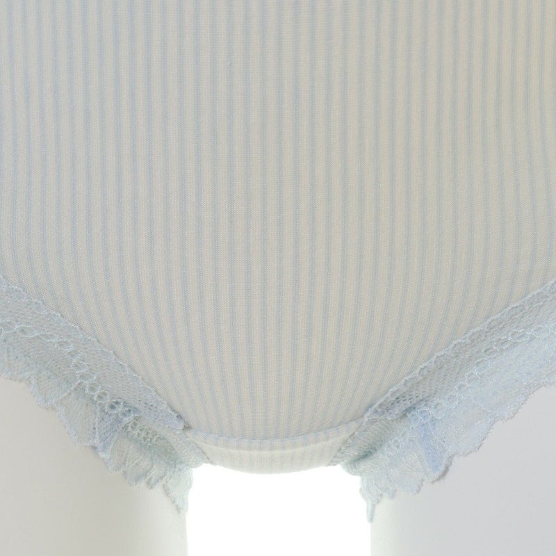 キッドブルー定番のアイコン、KBベンベルグベア天シリーズが6年ぶりにリニューアル。ブランドカラーの定番サックスにピンクが仲間入り。快適な素材はそのままに、カラーを少し落ち着かせ、ストライプピッチはやや狭く、レースも配色から同色にすることで、より大人っぽいデザインに生まれ変わりました。素材のベンベルグはコットンの産毛由来の再生繊維で肌にも環境にも優しく、吸放湿に優れています。短繊維の糸をつむぐことで肌触りもまるでコットンのようなさらりとした着心地です。