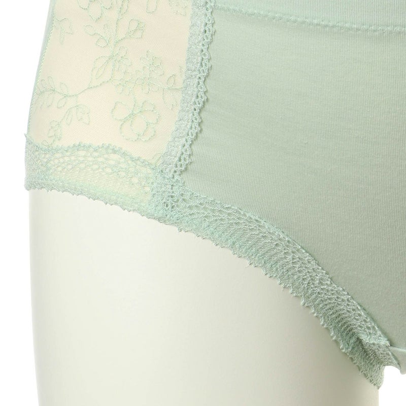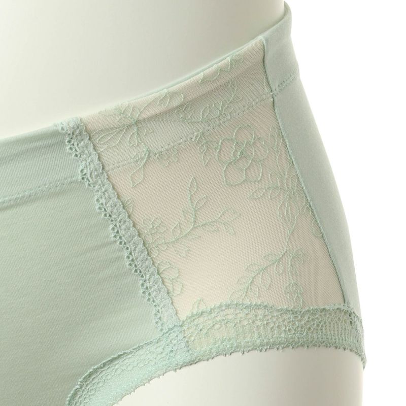 ストレッチチュールと綿ベア天の2素材を配色で組み合わせたインナーシリーズ。繊細な植物柄エンブロイダリーと淡いカラーリングが春らしい雰囲気。