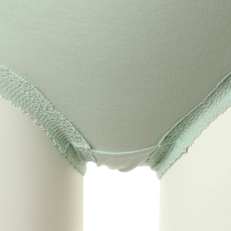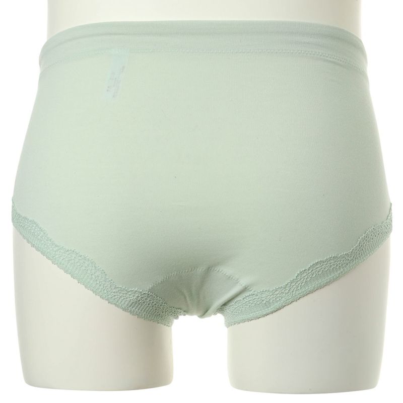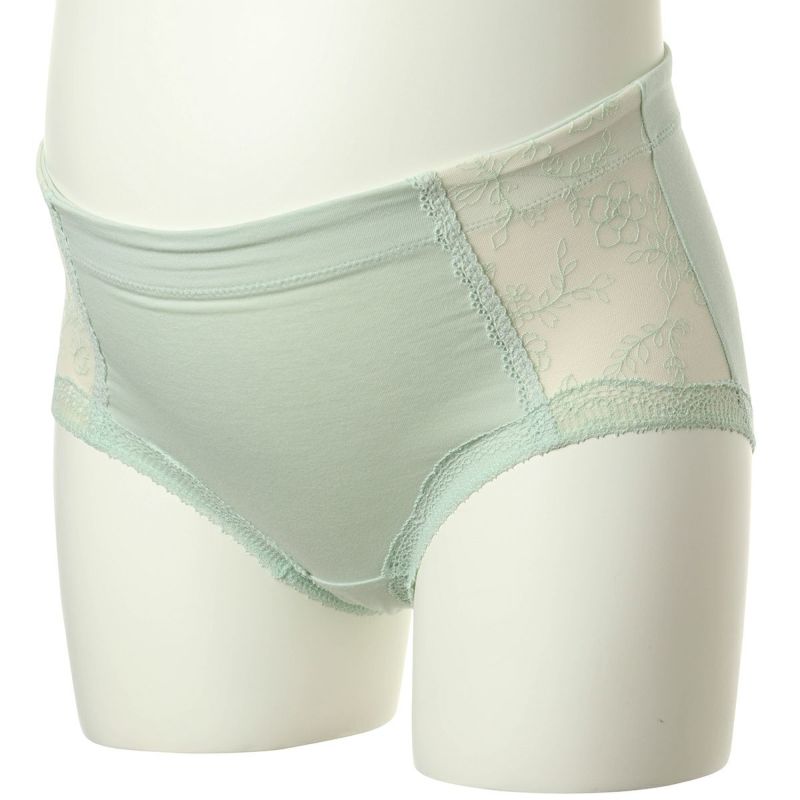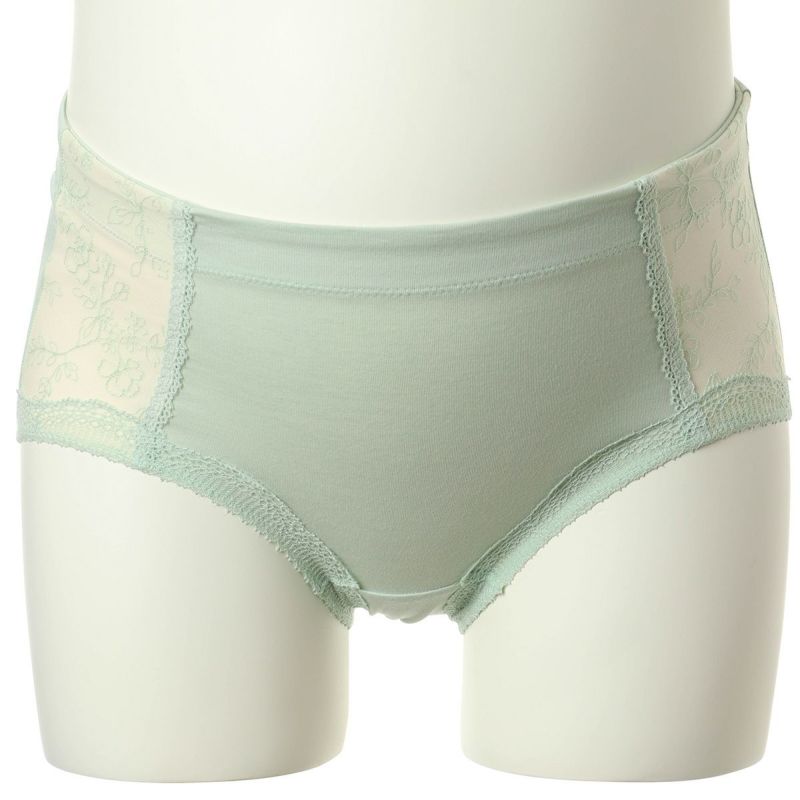 マタニティ仕様のショーツは、産前~産後のマタニティ体型のサイズ変化にも対応するつくり。チュール部分は肌に当たらないよう下に綿ベア天を重ねた2枚仕立て。