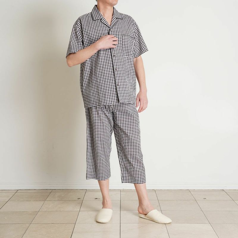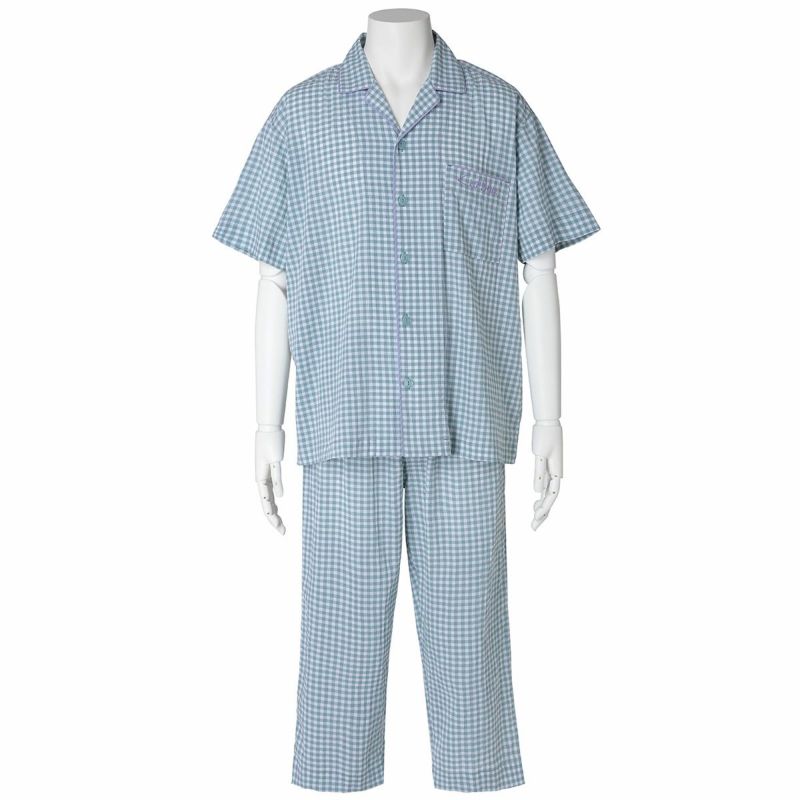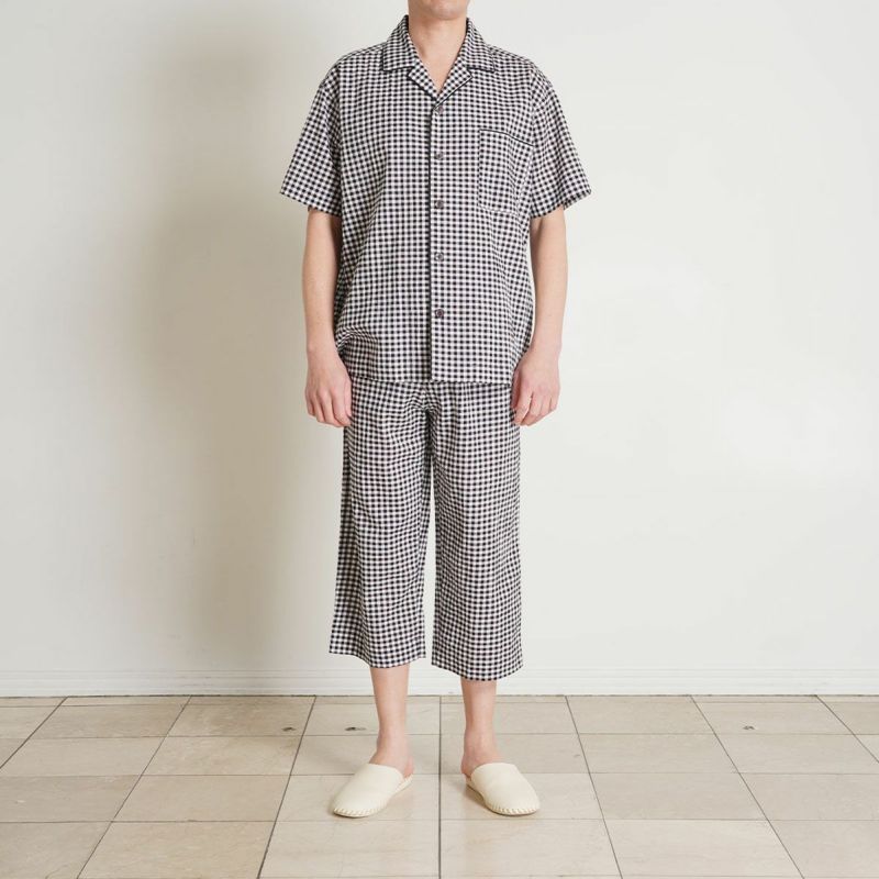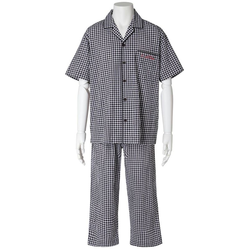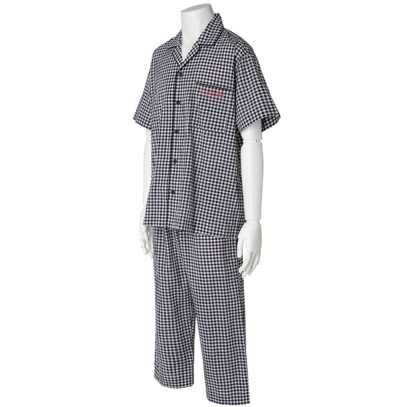 メンズの半袖パジャマは、人気の開襟シャツデザイン。前立てにはチェックから1色取ったパイピングですっきり洗練された印象に仕上げました。ポケットに施したロゴ刺繍がさりげないアクセント。パンツは涼しく着れる8分丈。同シリーズのレディースとお揃いコーディネートやペアギフトにもおすすめ。