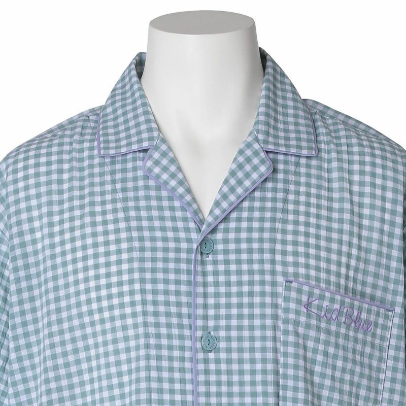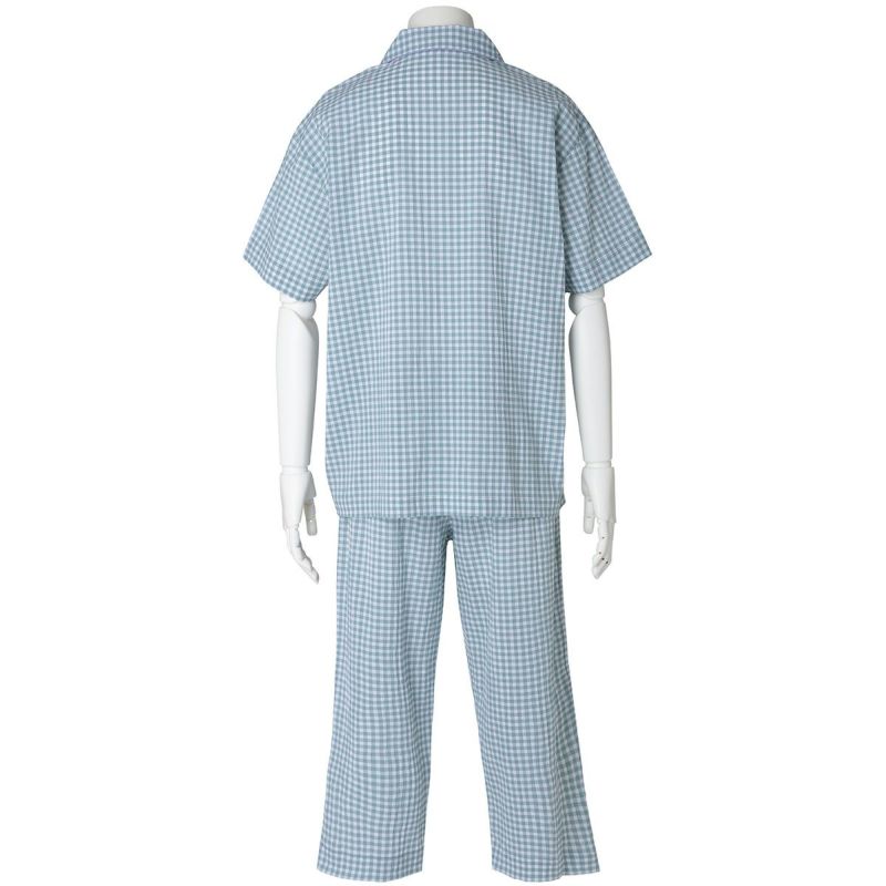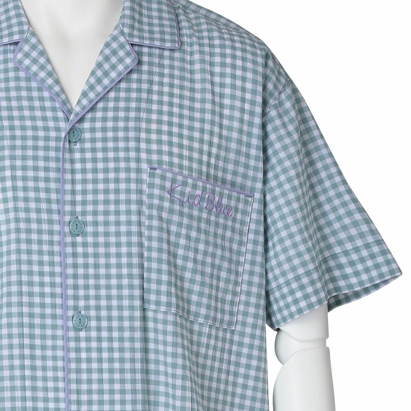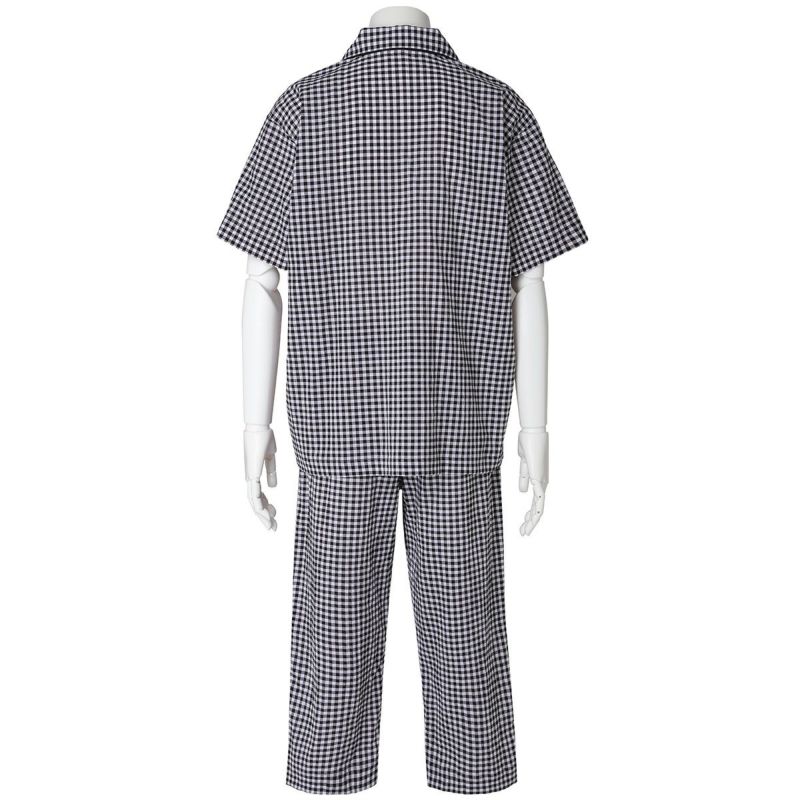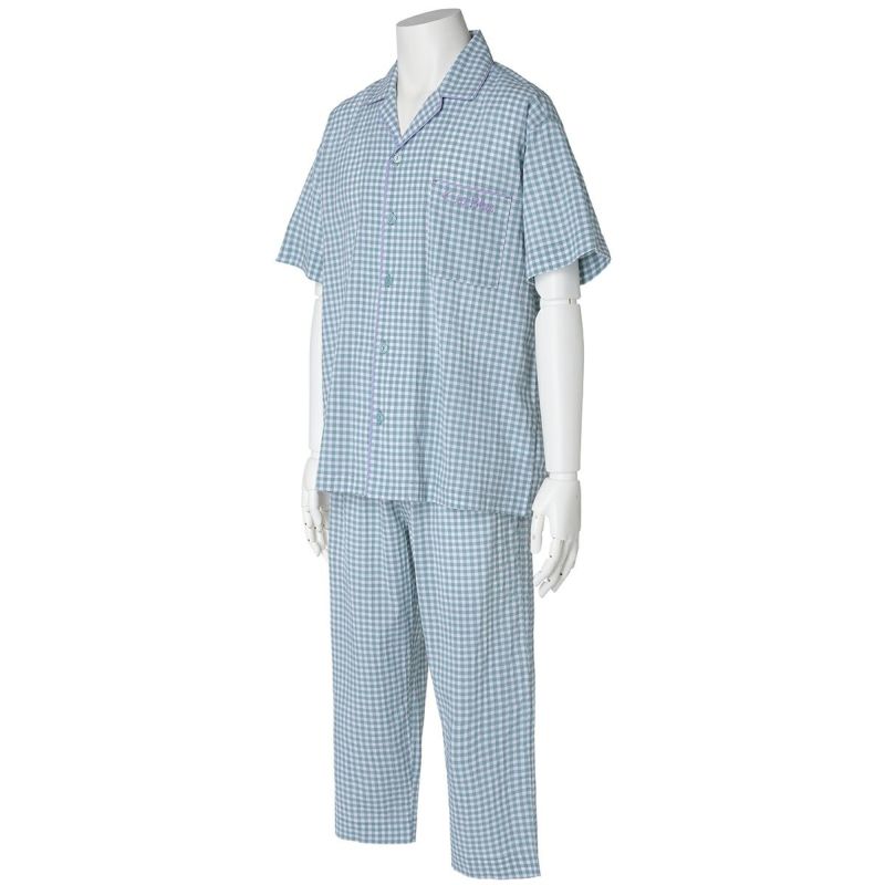 メンズの半袖パジャマは、人気の開襟シャツデザイン。前立てにはチェックから1色取ったパイピングですっきり洗練された印象に仕上げました。ポケットに施したロゴ刺繍がさりげないアクセント。パンツは涼しく着れる8分丈。同シリーズのレディースとお揃いコーディネートやペアギフトにもおすすめ。