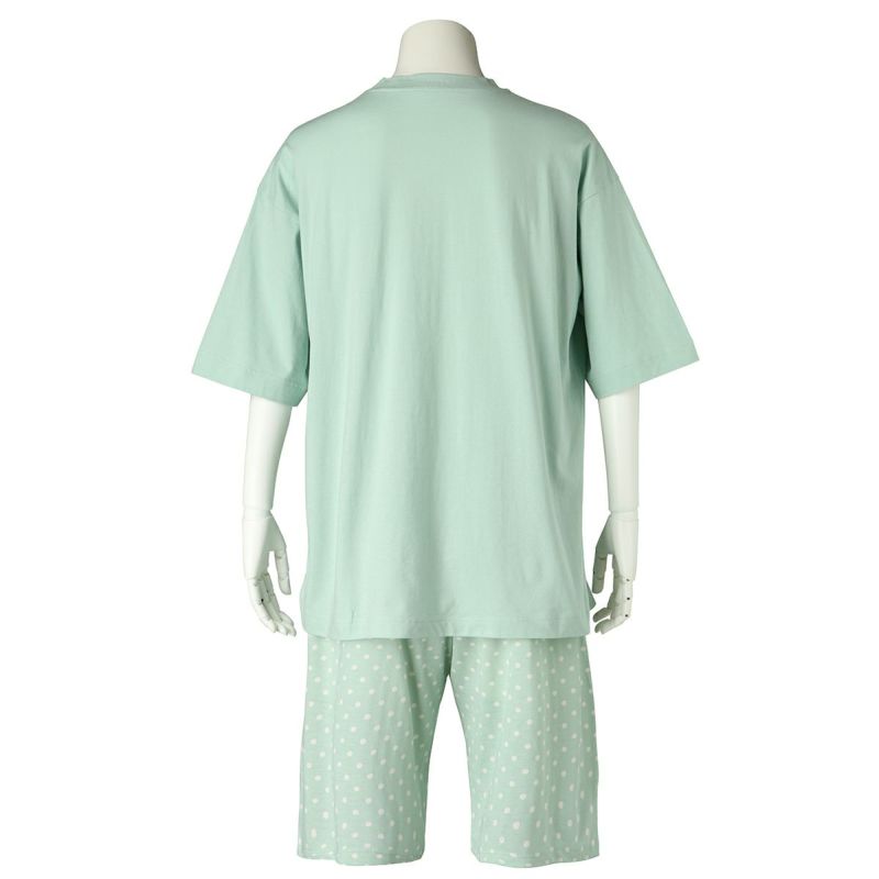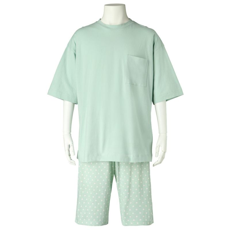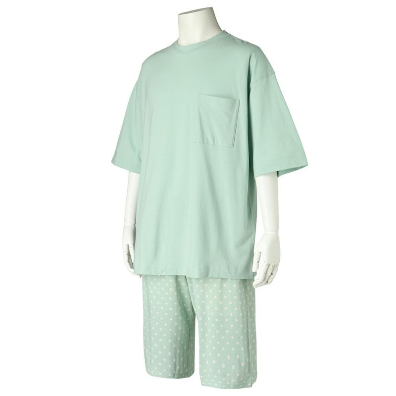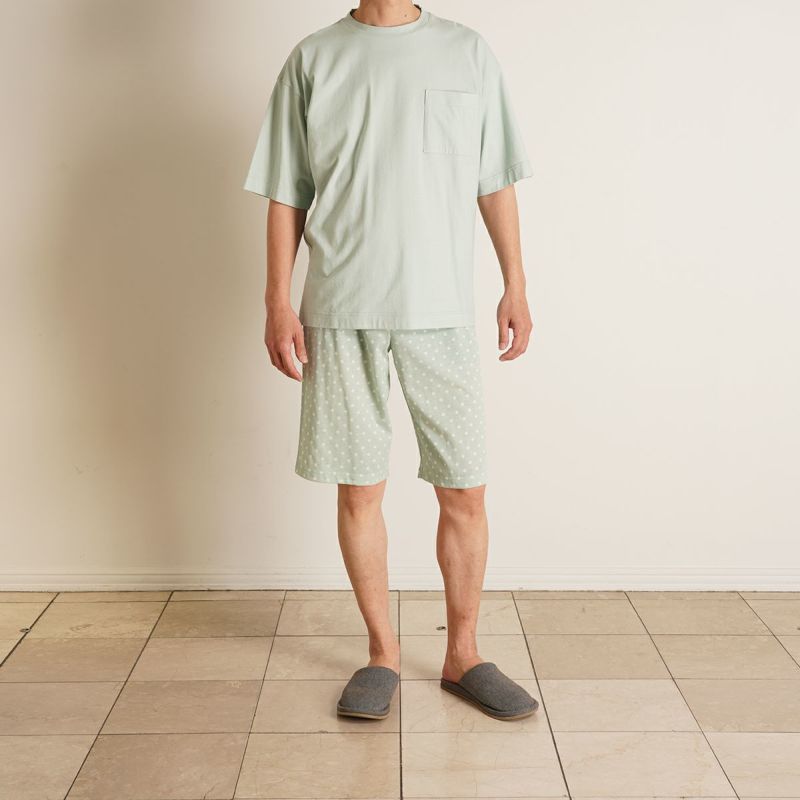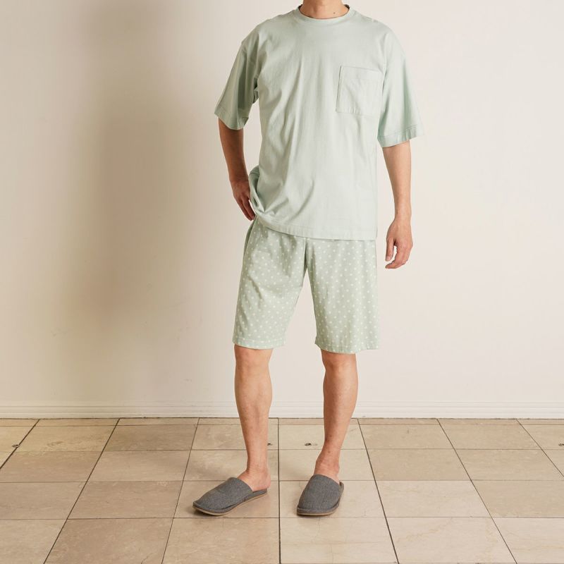 メンズ半袖パジャマは、シンプルな無地Tシャツとドット柄ボトムのセット。ペアコーデもおすすめ。