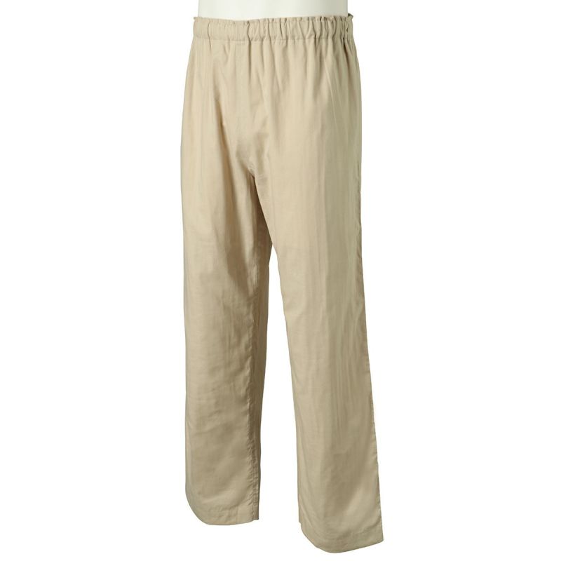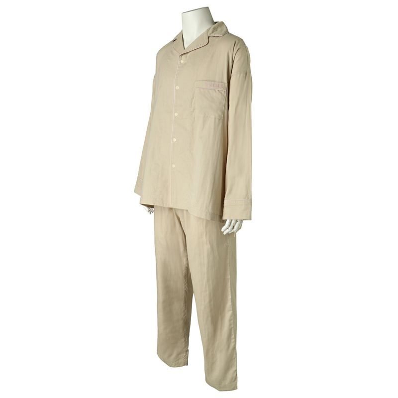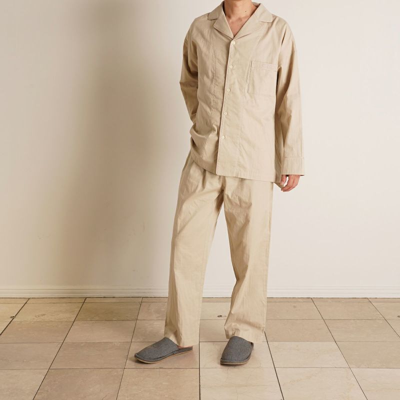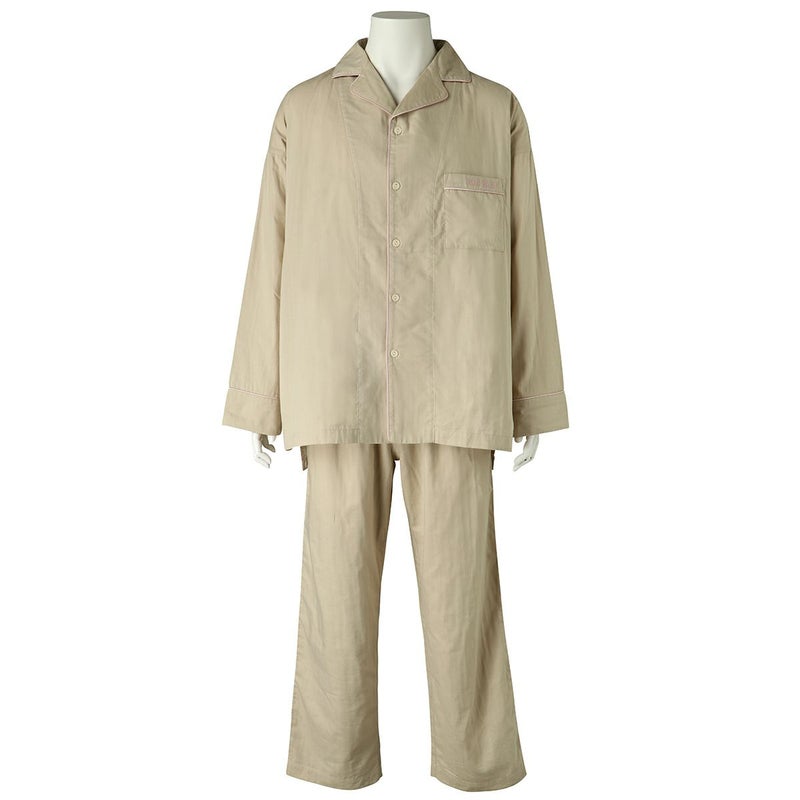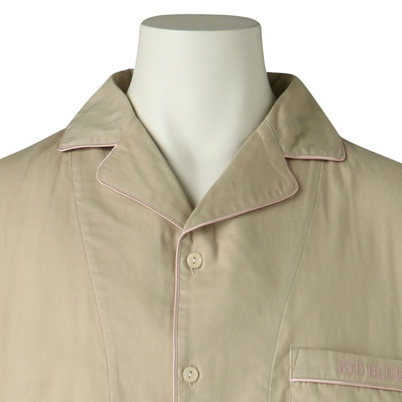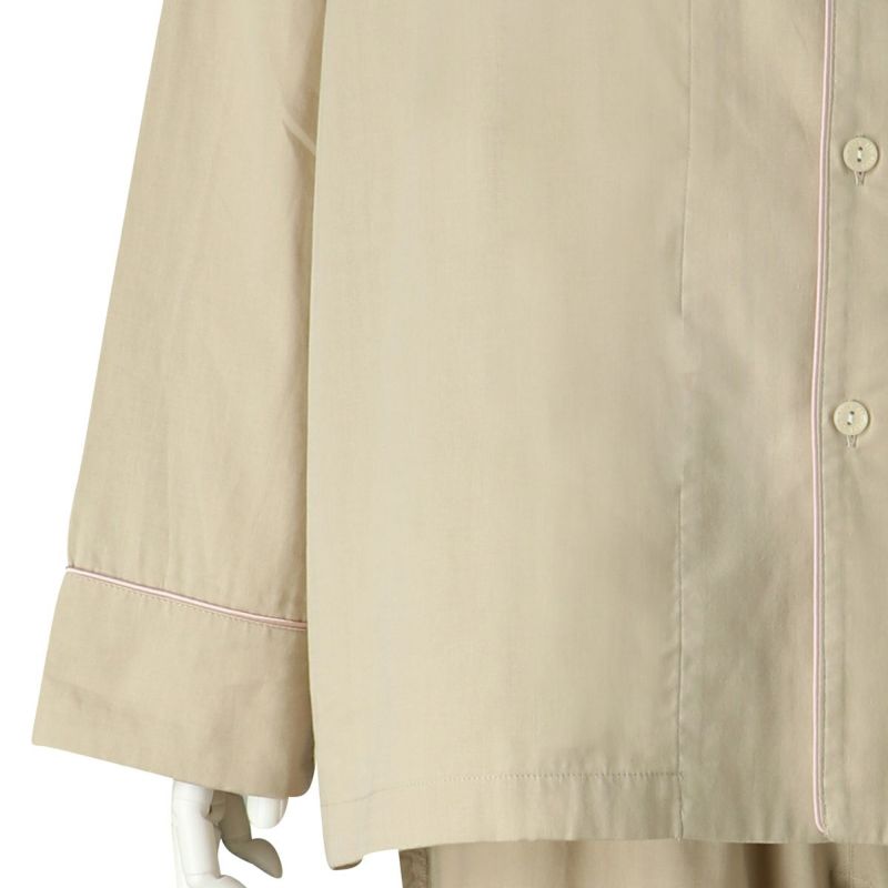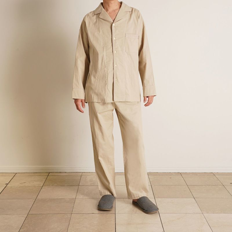 ベーシックな開襟シャツデザインのメンズ長袖パジャマ。襟ぐりはパイピングを入れ、見返しや裾も三つ折りで縫製しより肌当たりがよくなるようこだわった丁寧な作り。薄いピンクのパイピングの組み合わせが新鮮なベージュで優しい雰囲気です。