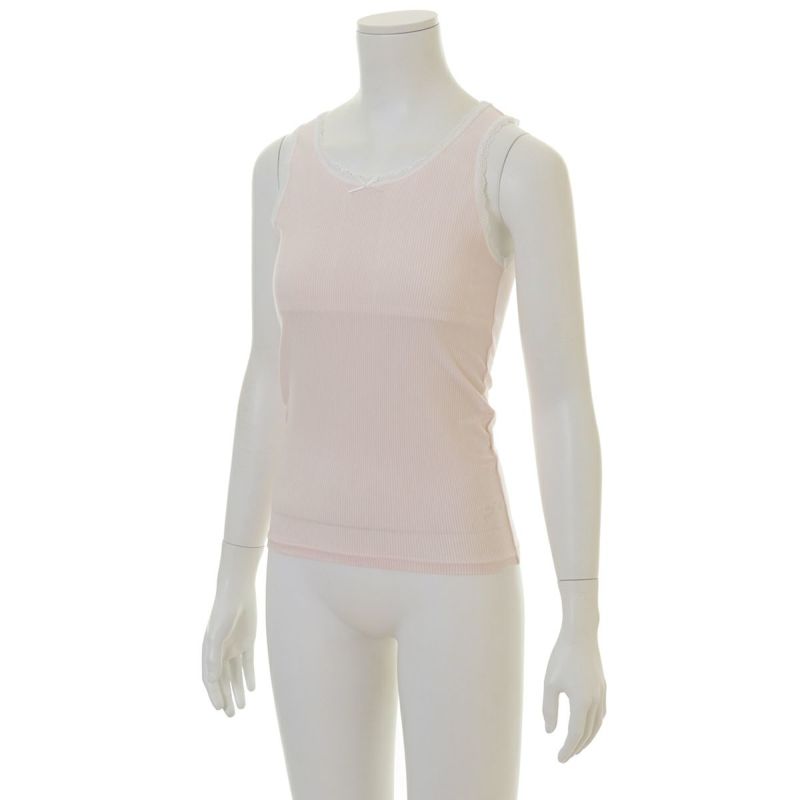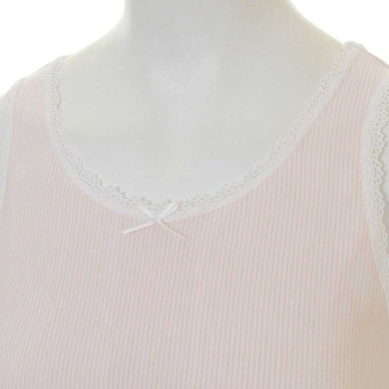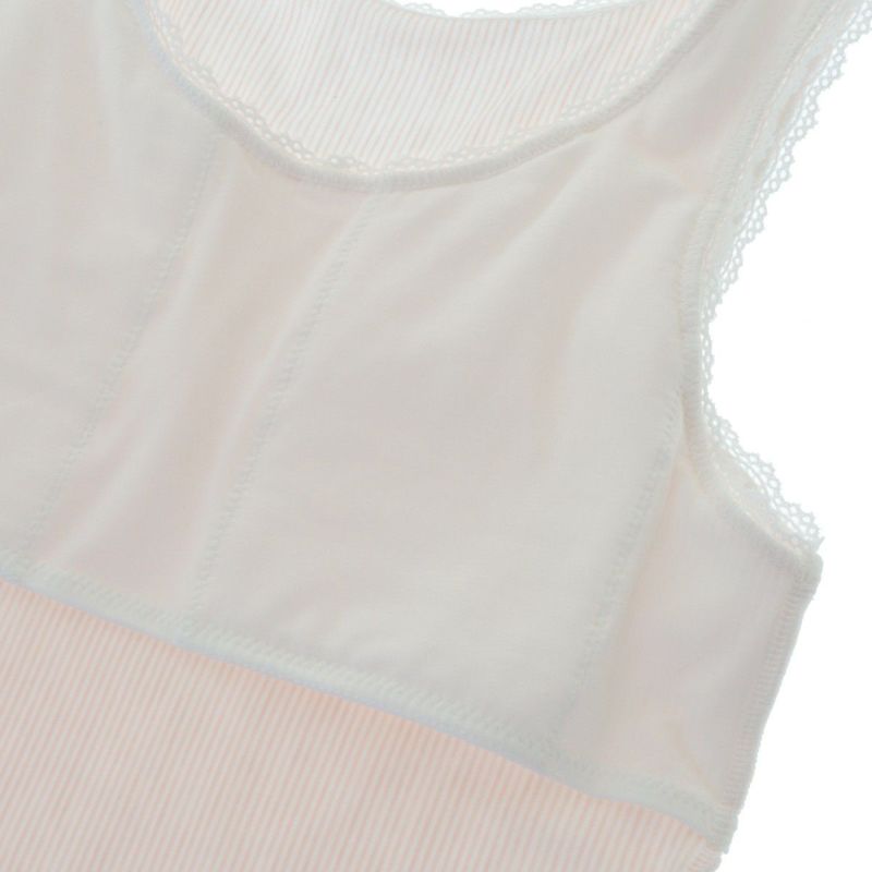 キッズ用キャミソールは人気のタンクトップデザイン。襟周りに細レースを施しました。デコルテ中心にプチリボン付き。キッズ用インナーにはお子様らしい白い細レースを使用しました。120.130cmは胸当てなし、140.150サイズは胸当て付仕様です。