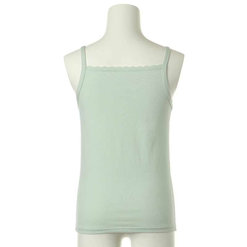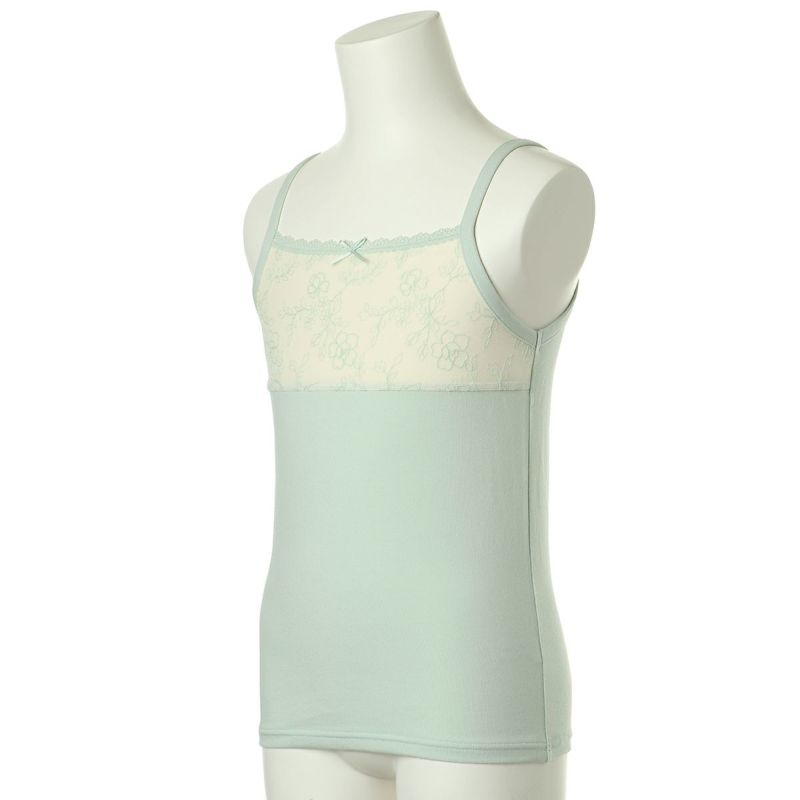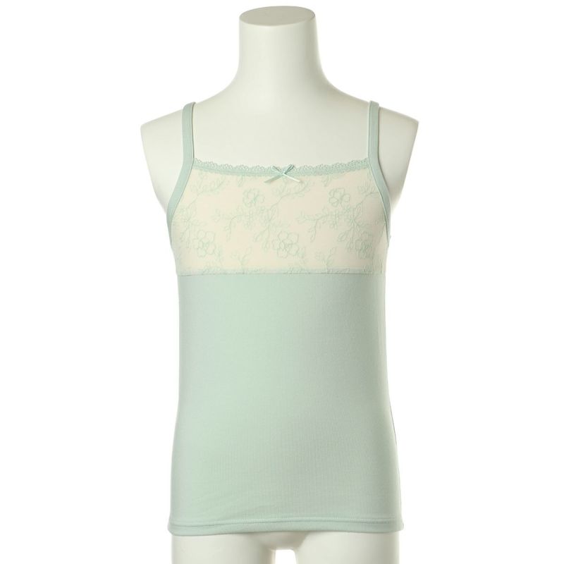 キッズ用キャミソールは、センターにプチリボンを配置した前後がわかりやすいデザイン。チュール部分は綿ベア天を重ねた2枚仕立て。ストラップは肌に優しい綿ベア天を使用。