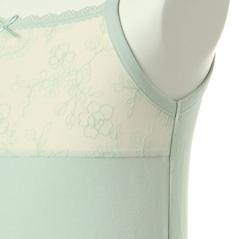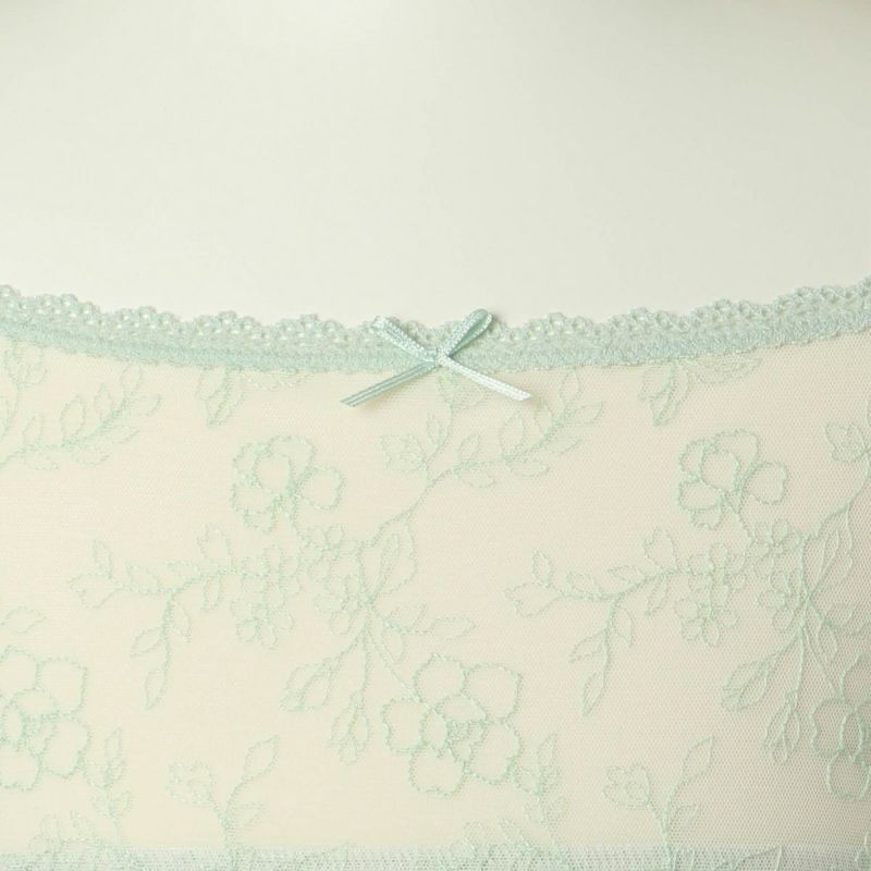 ストレッチチュールと綿ベア天の2素材を配色で組み合わせたインナーシリーズ。繊細な植物柄エンブロイダリーと淡いカラーリングが春らしい雰囲気。