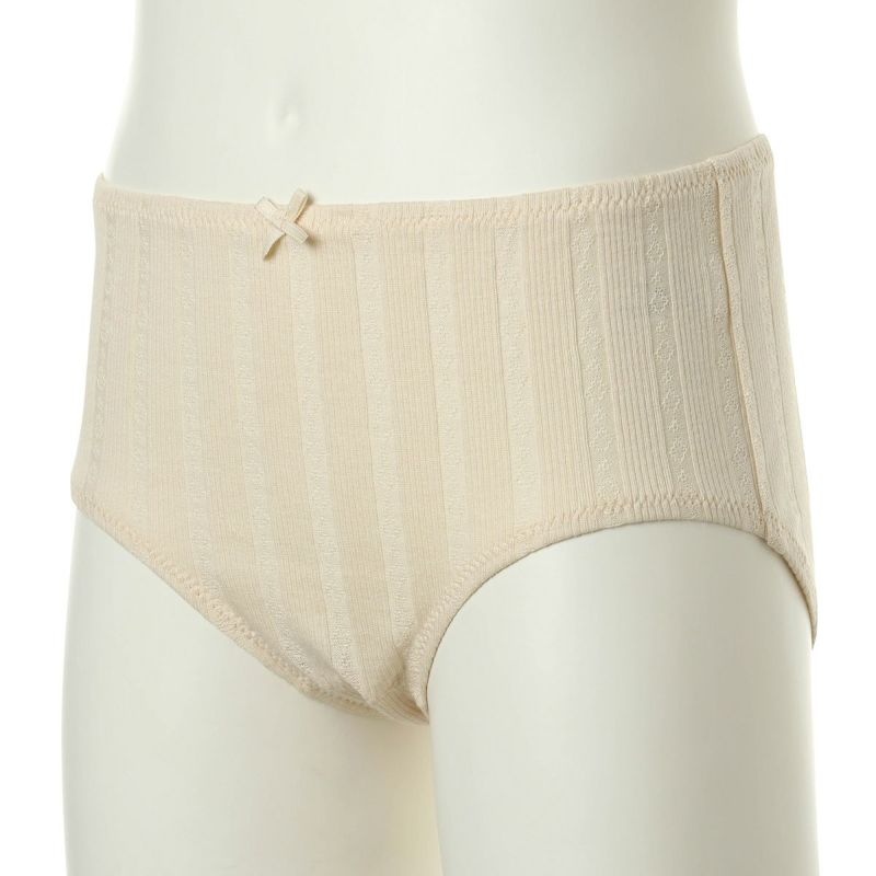 キッズ用ショーツは、肌に優しいノンレース仕様でシンプルなデザイン。フロントに同色プチリボンを配置。カラーは脱色や染色をしていない綿本来の色を使用。