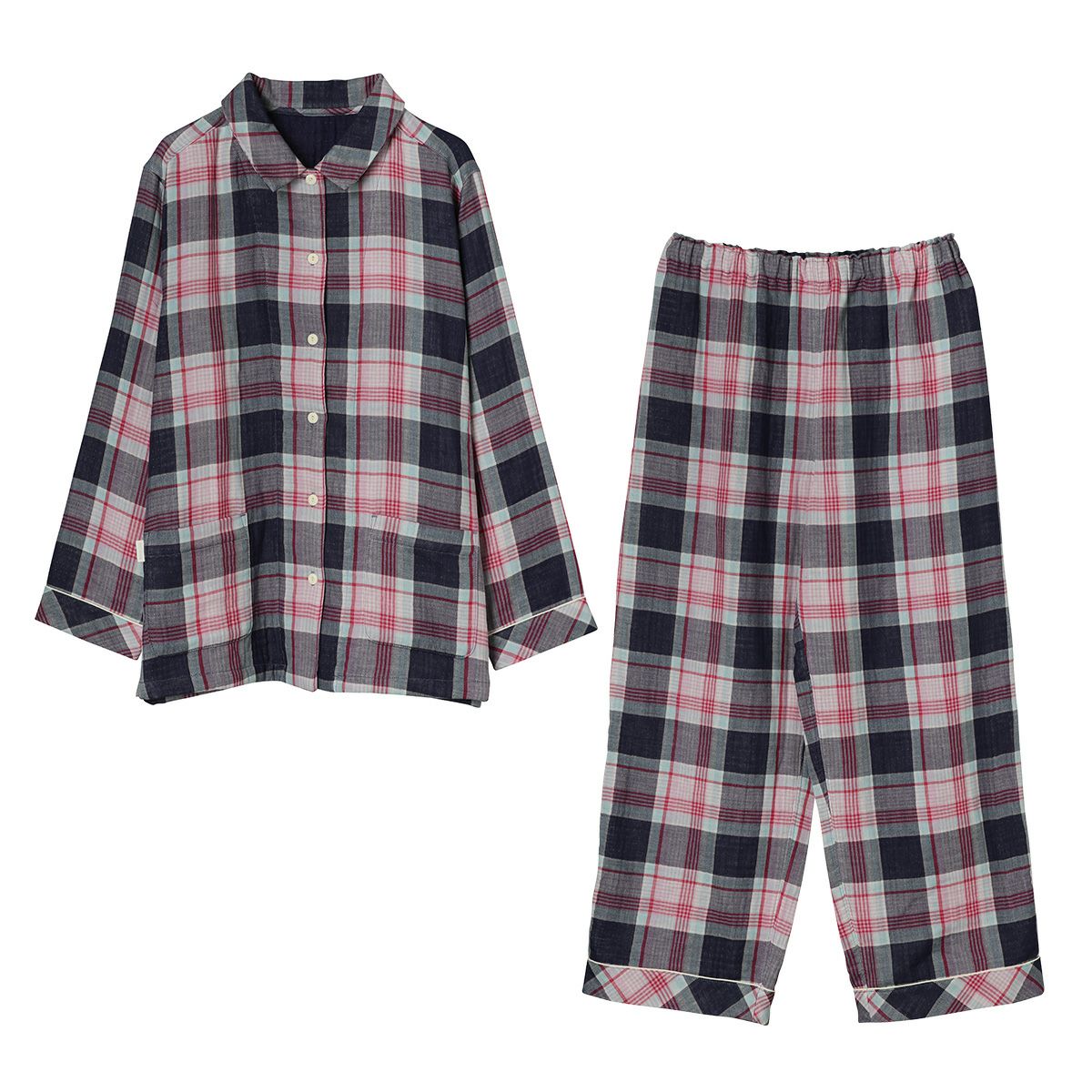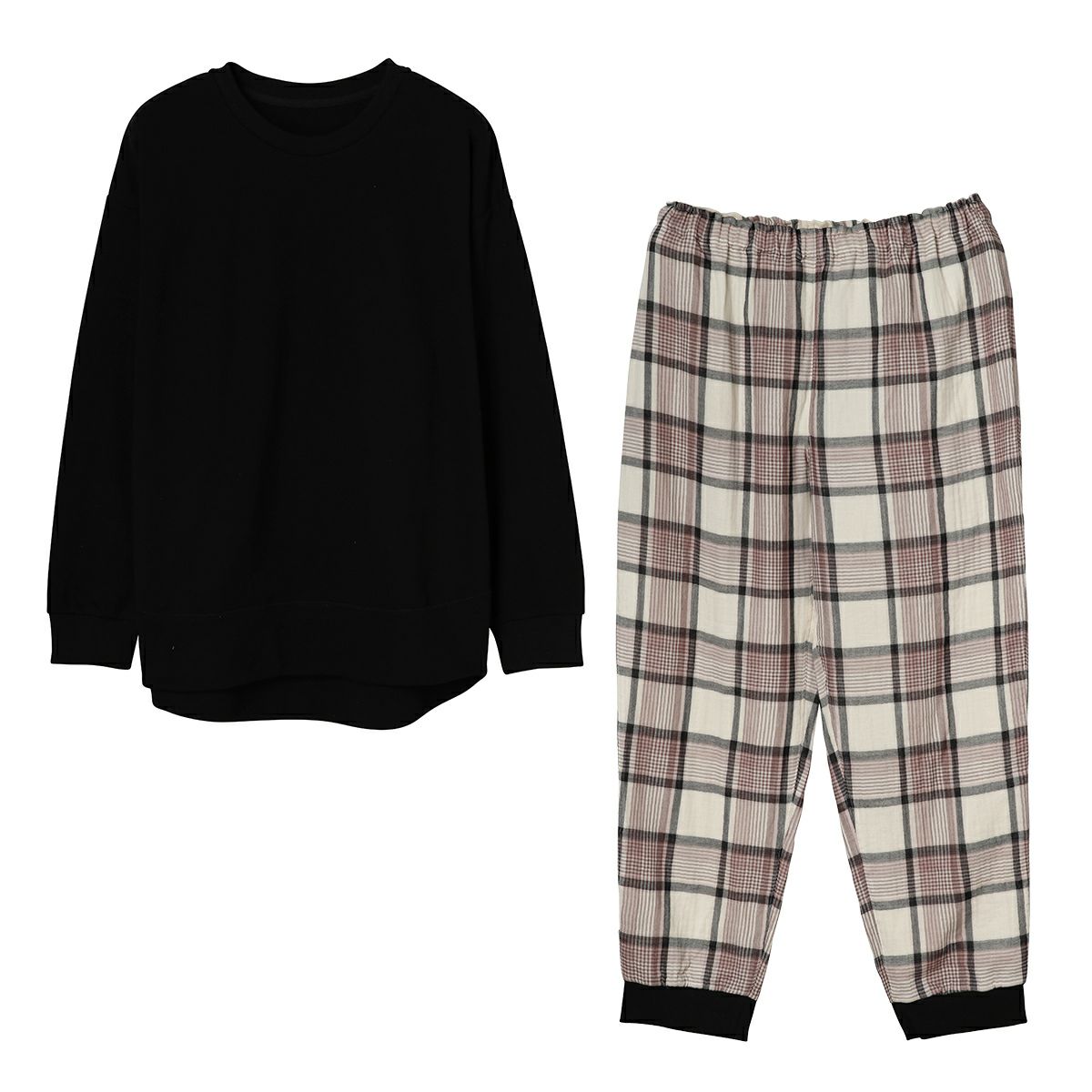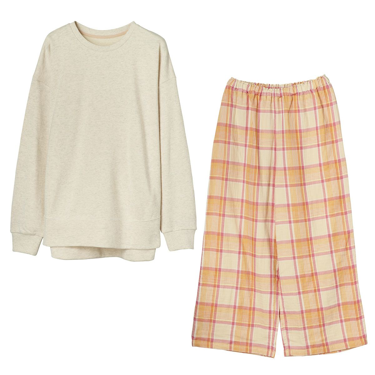 画像は【トリプルガーゼコンフィチェック】のルームウェア風パジャマ。ボトムはトリプルガーゼ、トップは同じく綿100%の裏毛素材がセットです。セミワイドシルエットのボトムにややドロップショルダーのトップでゆったりリラクシーな着心地です。