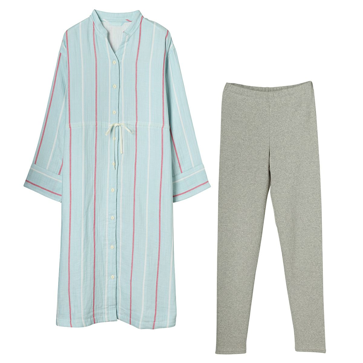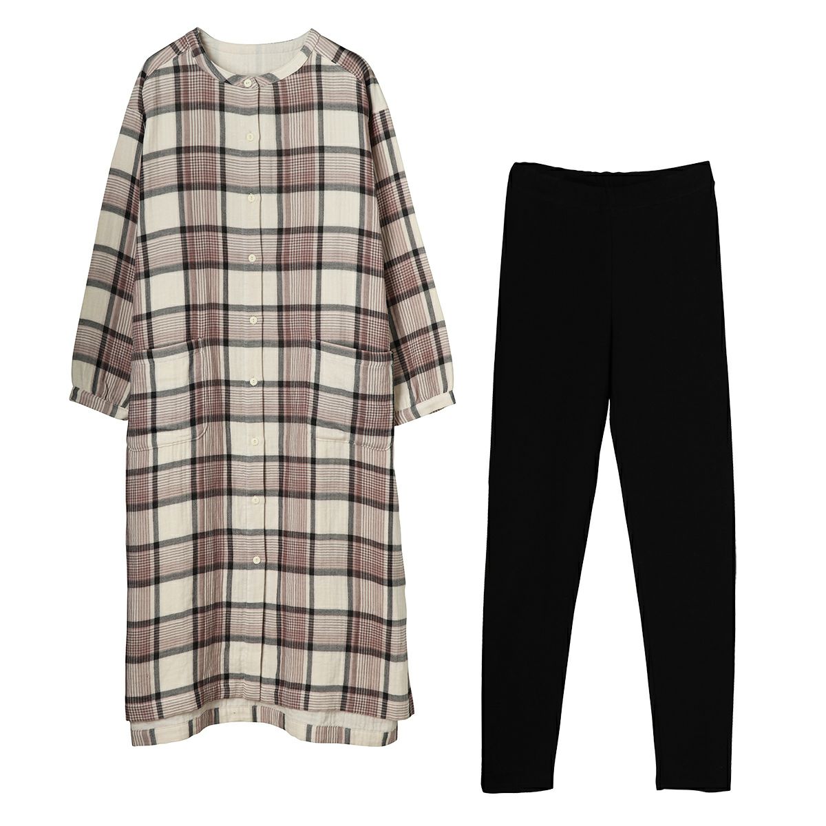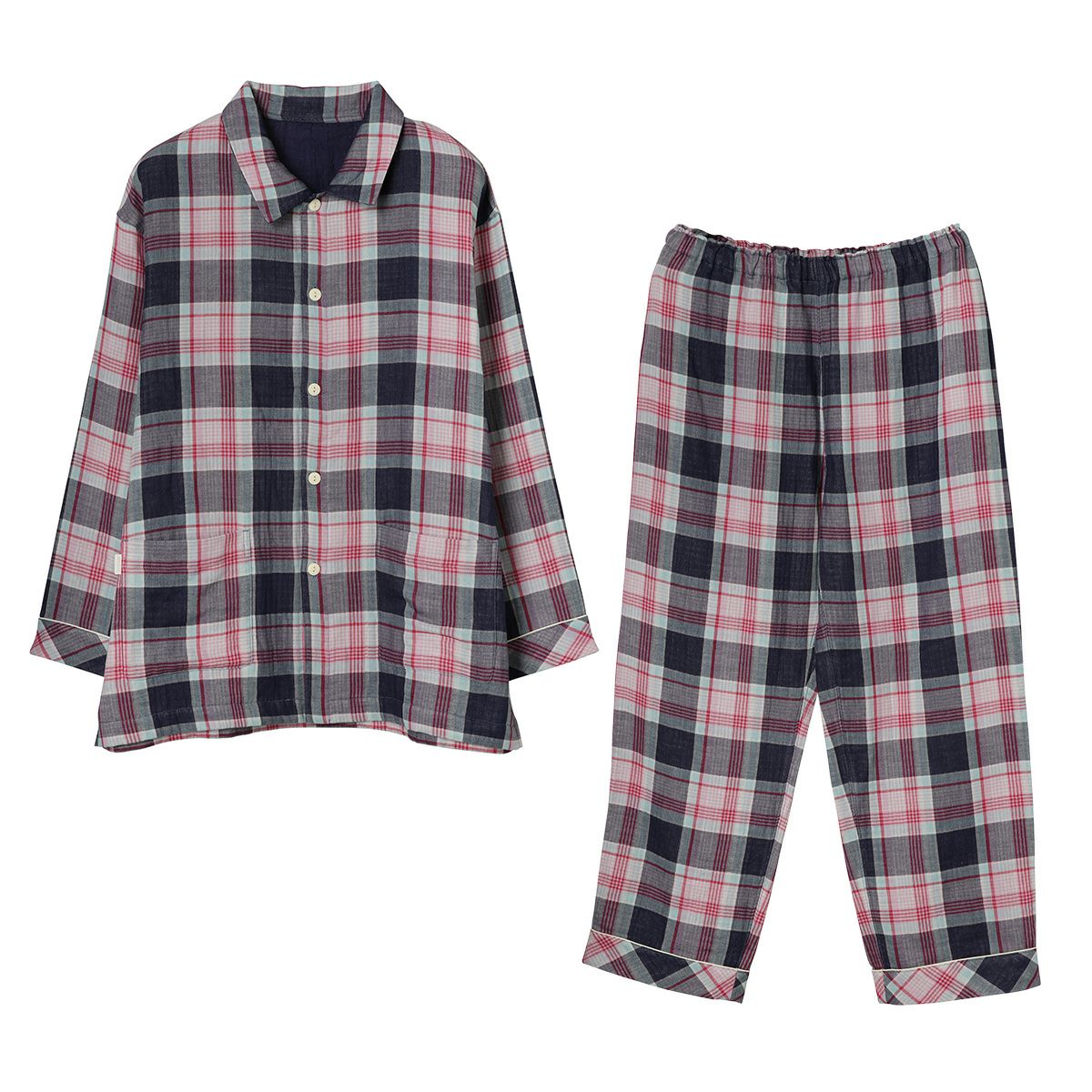 画像は【トリプルガーゼコンフィチェック】のルームウェア風パジャマ。ボトムはトリプルガーゼ、トップは同じく綿100%の裏毛素材がセットです。セミワイドシルエットのボトムにややドロップショルダーのトップでゆったりリラクシーな着心地です。