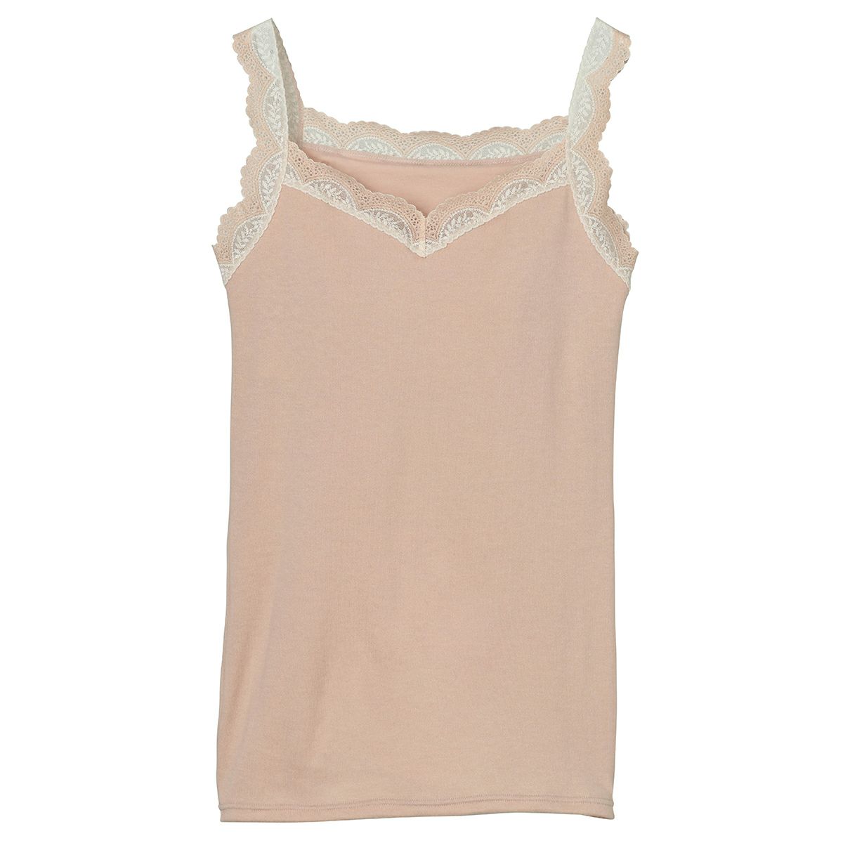【左上】落ち着いたトーンのピンクベージュカラー。存在感のあるレースは、スカラップにあたたかみのあるモール糸を使用。