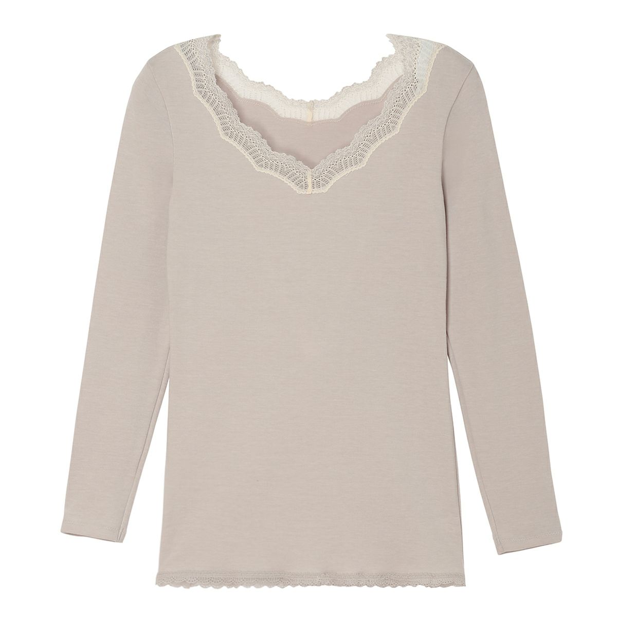 パタンナーA「程よいフィット感、程よい厚みでとにかく着心地がいいです。あとはいわゆるババシャツなのにちゃんとおしゃれで可愛いってところも大事!レースがちゃんと付いていることが見た目にもポイントになっているし、裾、袖口がフラットになるので、アウターに響かないところも利点です。」