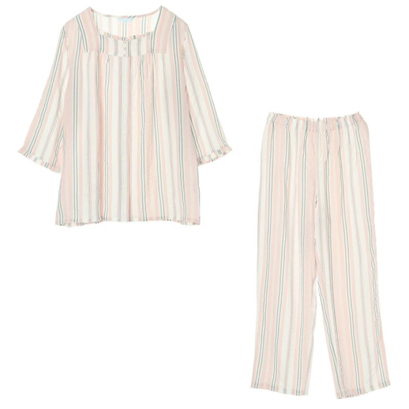 カラフルなマルチストライプのナイトウェアはレーヨン混合の柔らかサッカー素材。こちらも肌離れがよい凹凸感で、汗ばむ季節にも心地よいシリーズです。