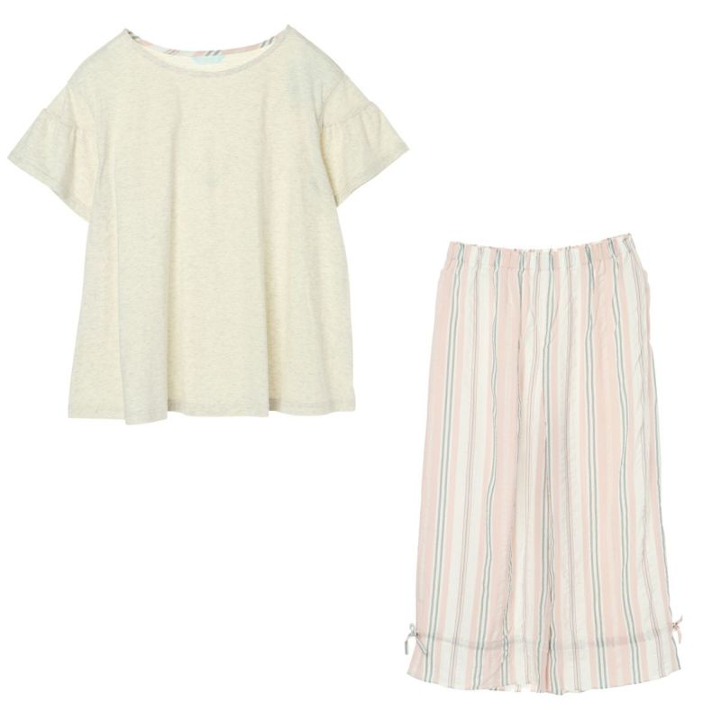 ノースリーブナイティや半袖パジャマには一部カットソー素材と組み合わせ、お部屋着やワンマイル風の着回しも可能です。4月発売予定です。